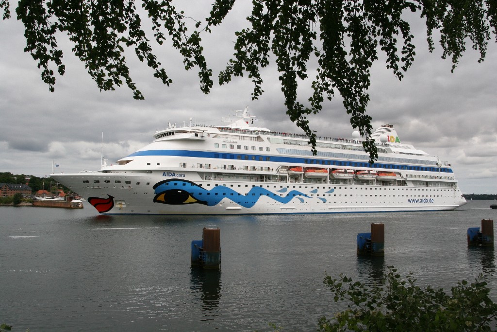 Die AIDAcara ist in der Höhe vom "Marine-Ehrenmal" in Laboe angekommen