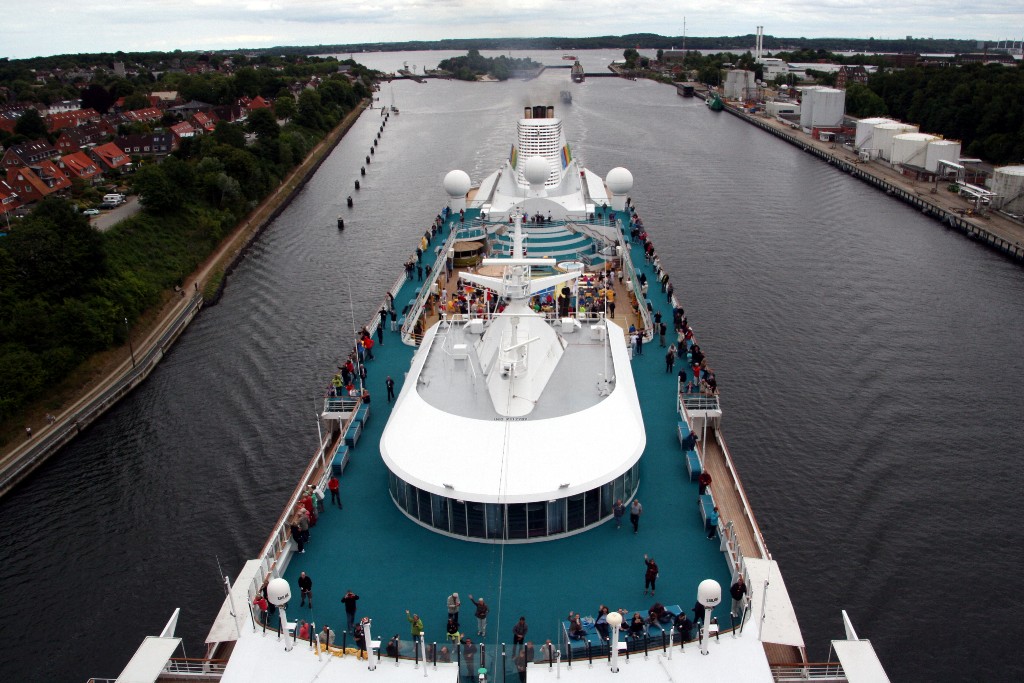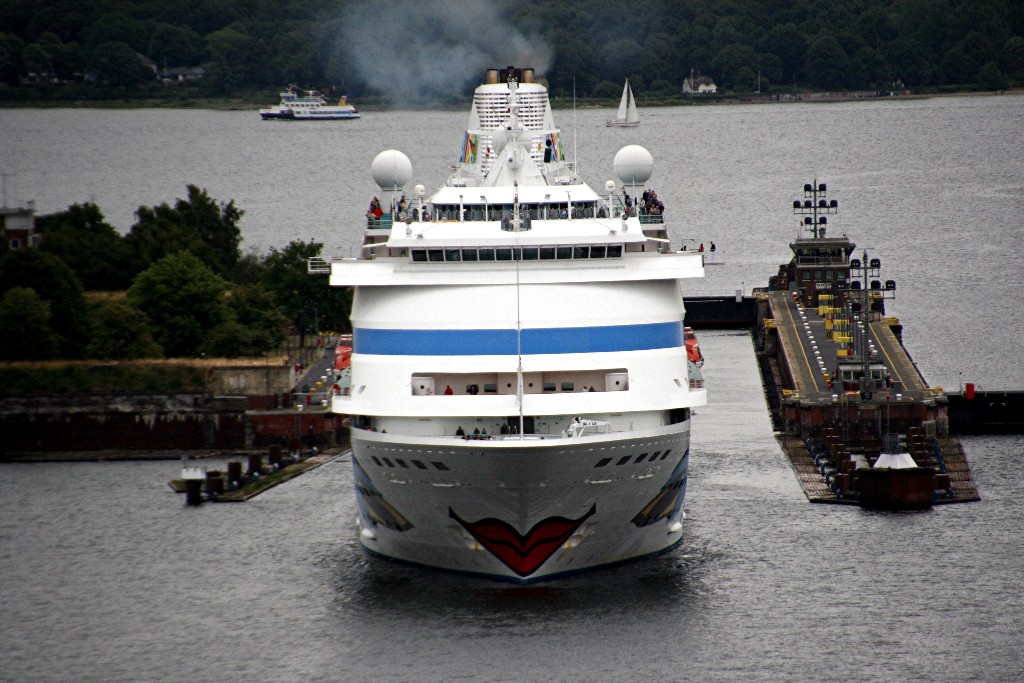Die AIDAcara fährt aus der Nordschleuse in den Nordostseekanal (im Hintergrund ist ein Fördedampfer mit Kurs in Richtung "Laboe" zu sehen)