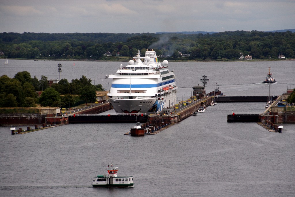 Die AIDAcara fährt aus der Nordschleuse in den Nordostseekanal (im Hintergrund ist ein Fördedampfer mit Kurs in Richtung "Laboe" zu sehen)