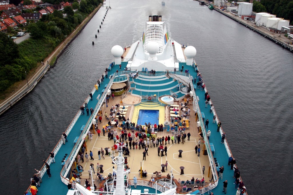 Auf dem Pooldeck gibt es eine Warteschlange und die AIDAcara fährt ihre Passage im Nordostseekanal mit einem kräftigen "Heizergruß"
