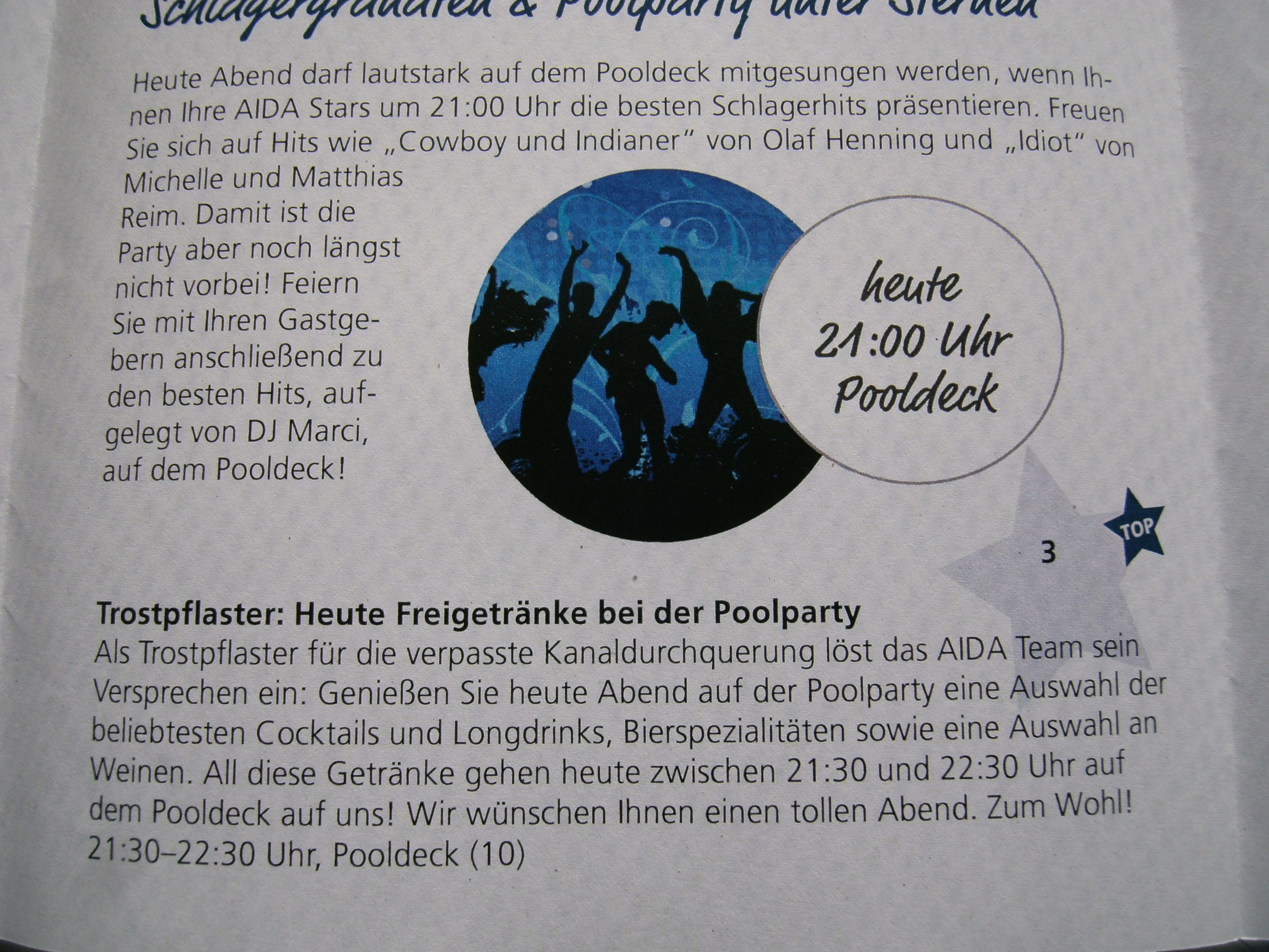 Also ne kleine Entschädigung - für die ausgefallene NOK Passage - wird sich AIDA schon einfallen lassen müssen... Bei uns - April 2017 - gab es in Oslo auf dem Pooldeck dann ne Stunde lang (gratis Frustsaufen)...