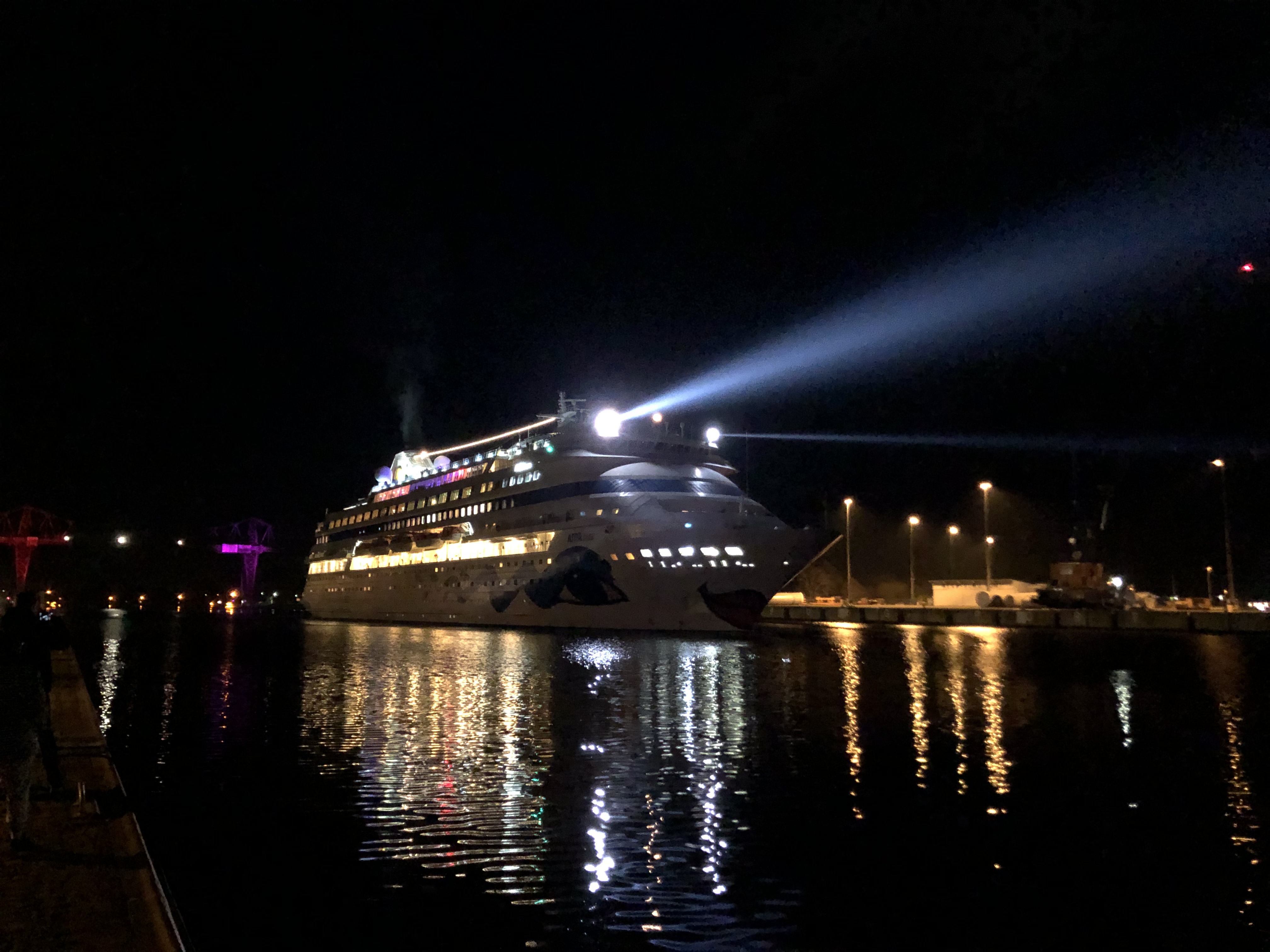 ...wir haben Sie uns gestern Abend dann gegen 22:00 Uhr im Kanal bei Rendsburg angesehen! Vernünftige Fotos waren aber auf Grund der Dunkelheit, der Beleuchtung und Bewegung des Schiffes sowie den uns immer wieder anleuchtenden Suchscheinwerfers mit dm IPhone X nicht wirklich möglich...