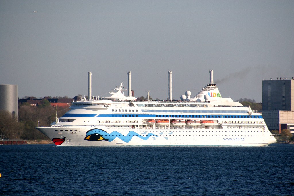 die AIDAcara mit ihren 4 neuen Schornsteinrohren in Warteposition auf der "Kieler Förde"