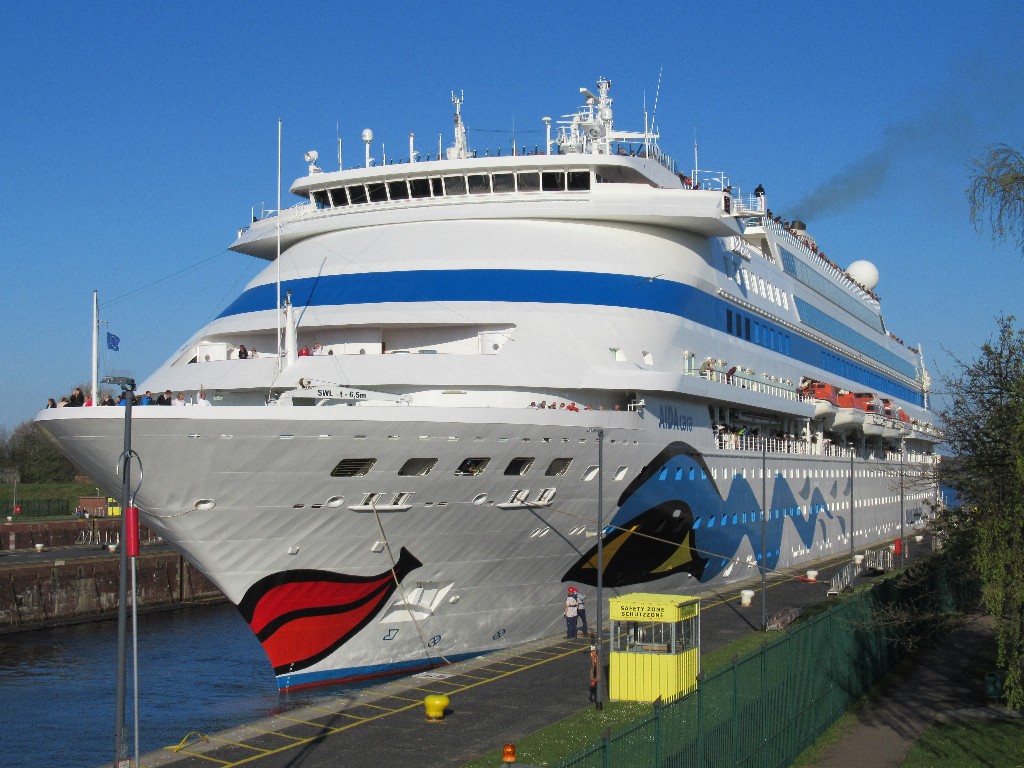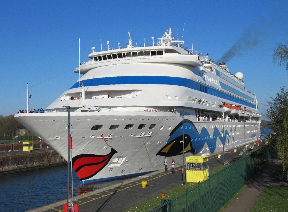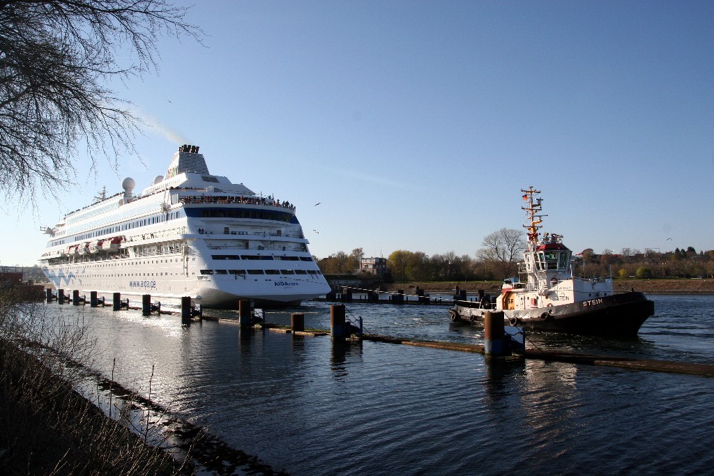 Die AIDAcara fährt mit Schlepperhilfe am Heck ihr Schleusenmanöver zum Nordostseekanal