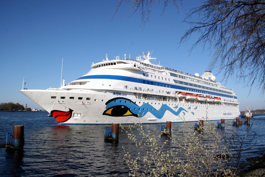 Die AIDAcara fährt mit Schlepperhilfe am Heck ihr Schleusenmanöver zum Nordostseekanal