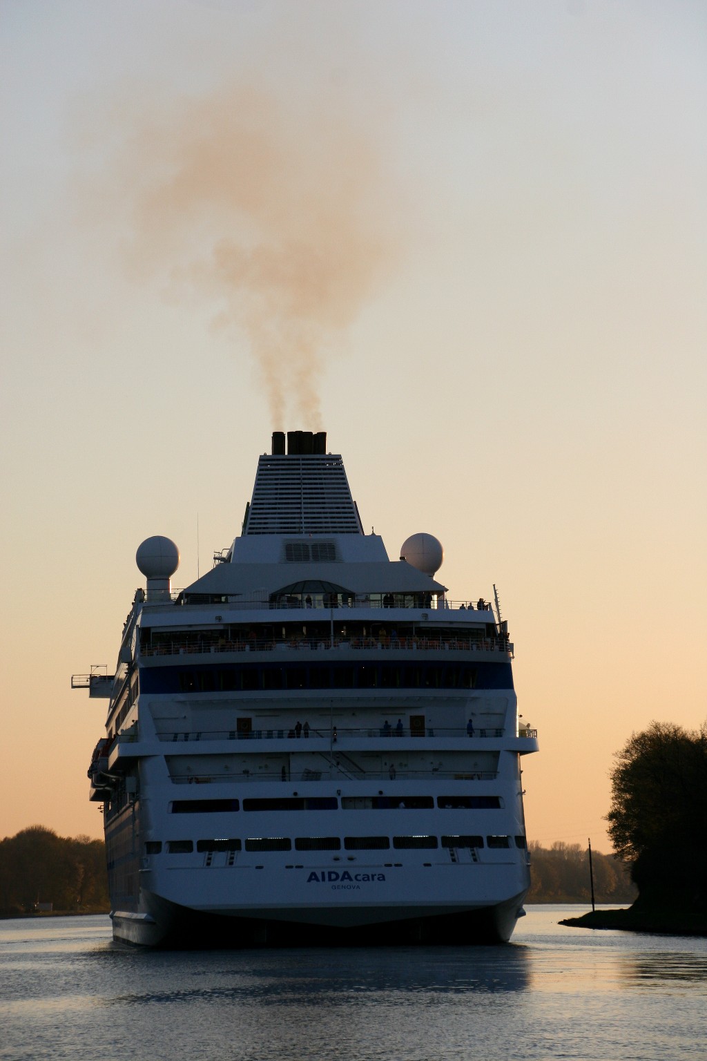 Die AIDAcara mit einem kräftigen "Heizergruß" in abendlicher Stimmung im Nordostseekanal