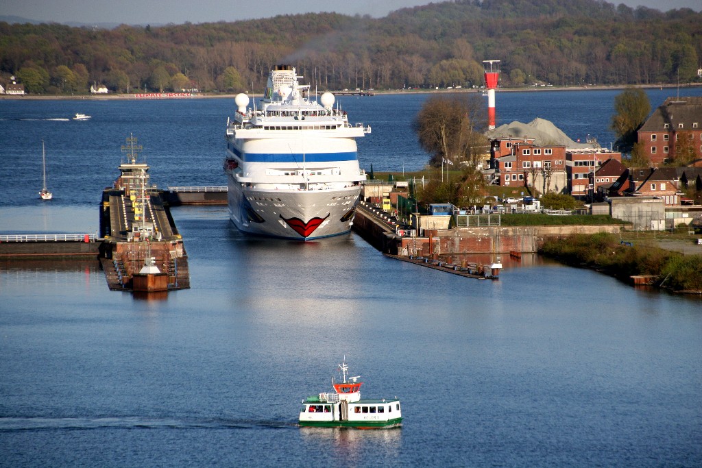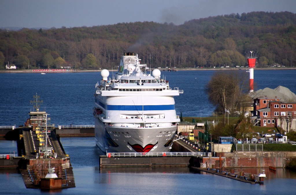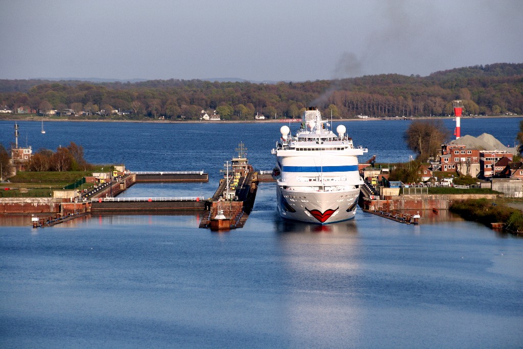 Die AIDAcara in der Südschleuse vom Nordostseekanal (das Schleusentor ist noch geschlossen)