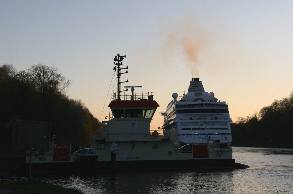 Die AIDAcara mit einem kräftigen "Heizergruß" in abendlicher Stimmung im Nordostseekanal