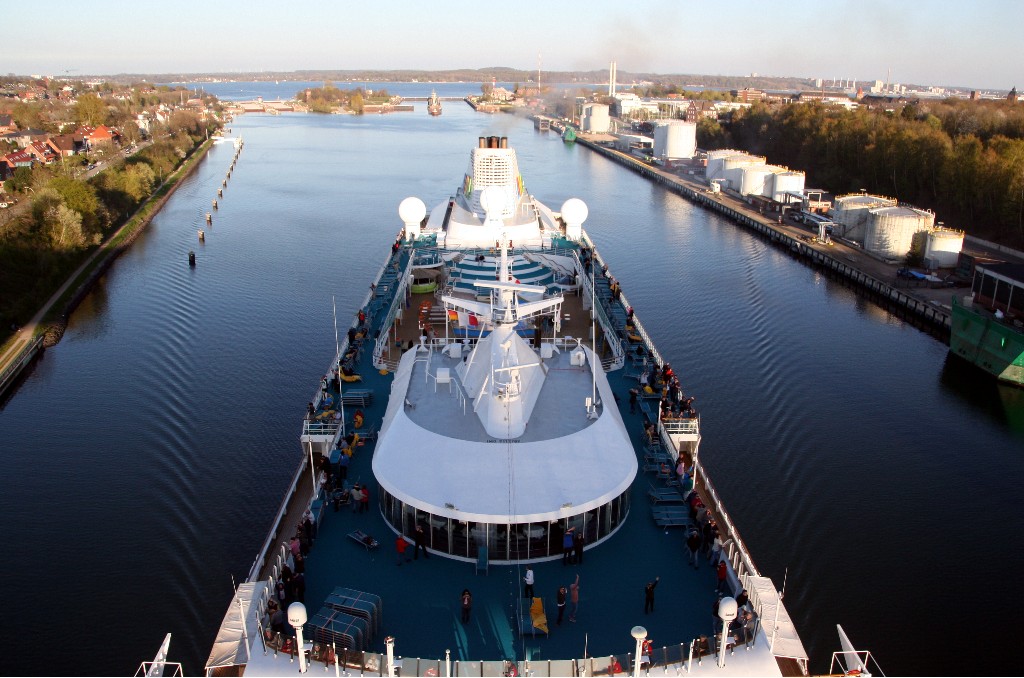 Die AIDAcara fährt jetzt ihr Auslaufmanöver in der Südschleuse vom Nordostseekanal