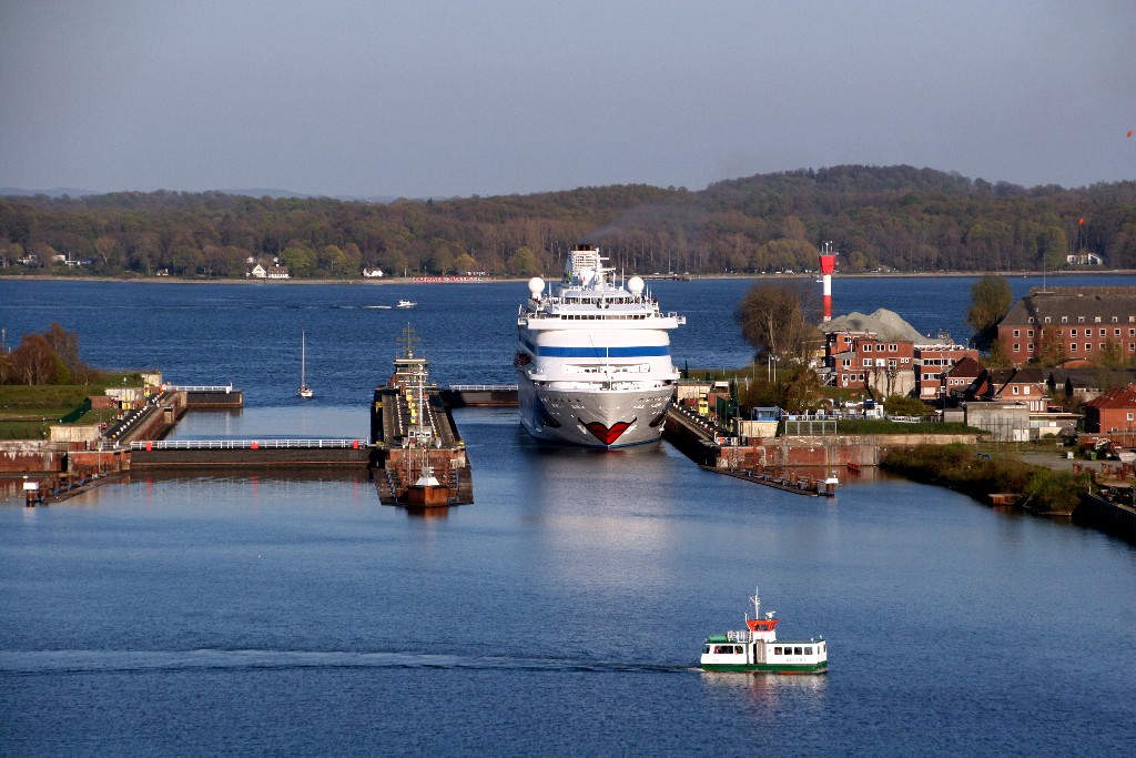 Die AIDAcara in der Südschleuse vom Nordostseekanal (das Schleusentor ist noch geschlossen)