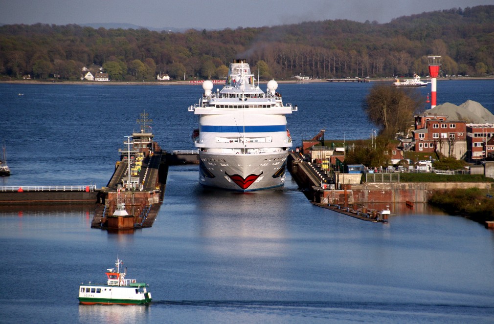 Später geht es mit der Panoramaaussicht von der "Holtenauer Hochbrücke" auf die AIDAcara im Nordostseekanal weiter