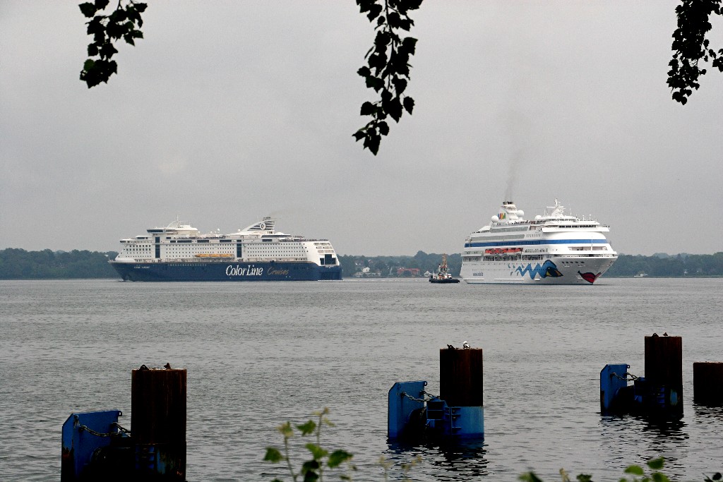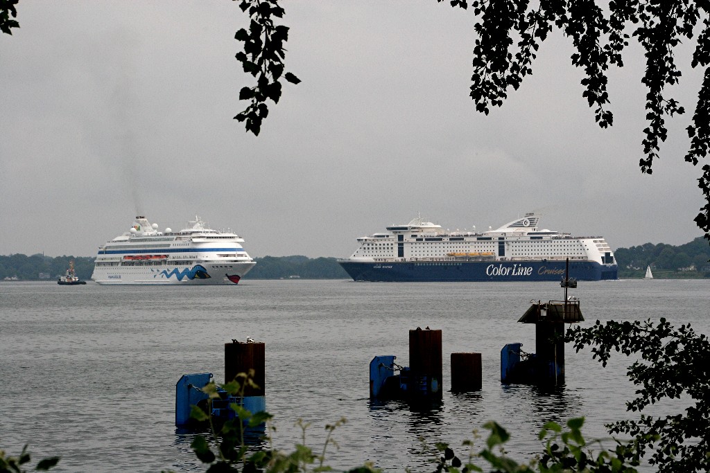 Die "Color Fantasy" fährt ihre Revierfahrt auf der "Kieler Förde" in Höhe der in Warteposition liegenden AIDAcara