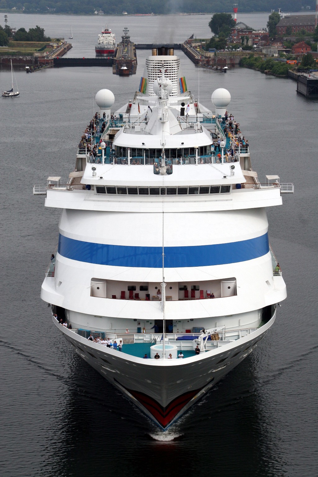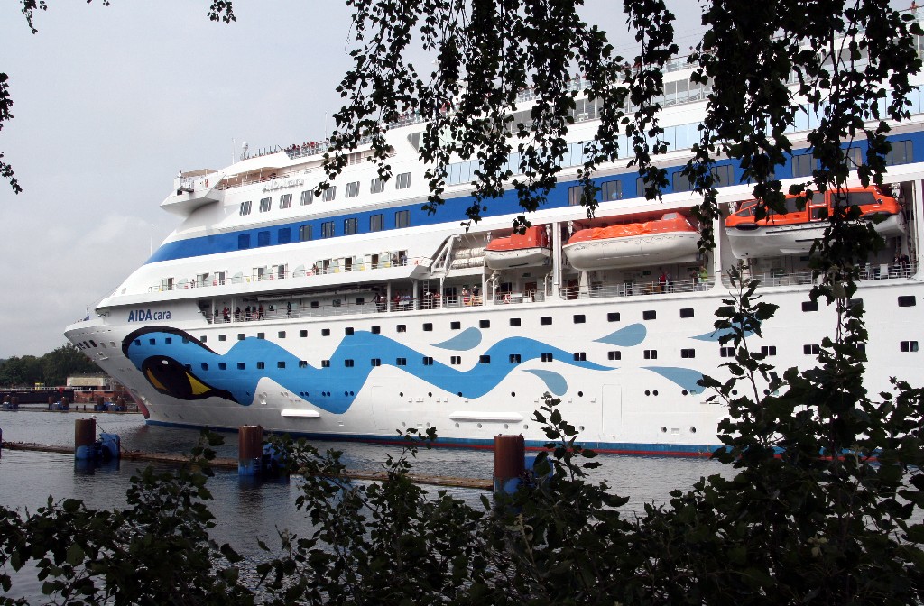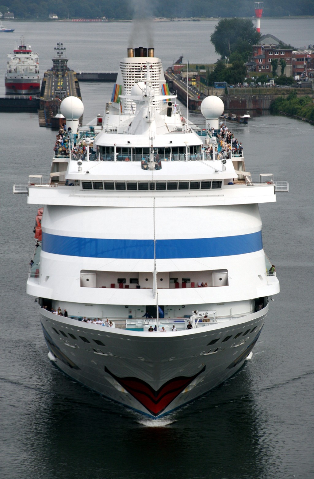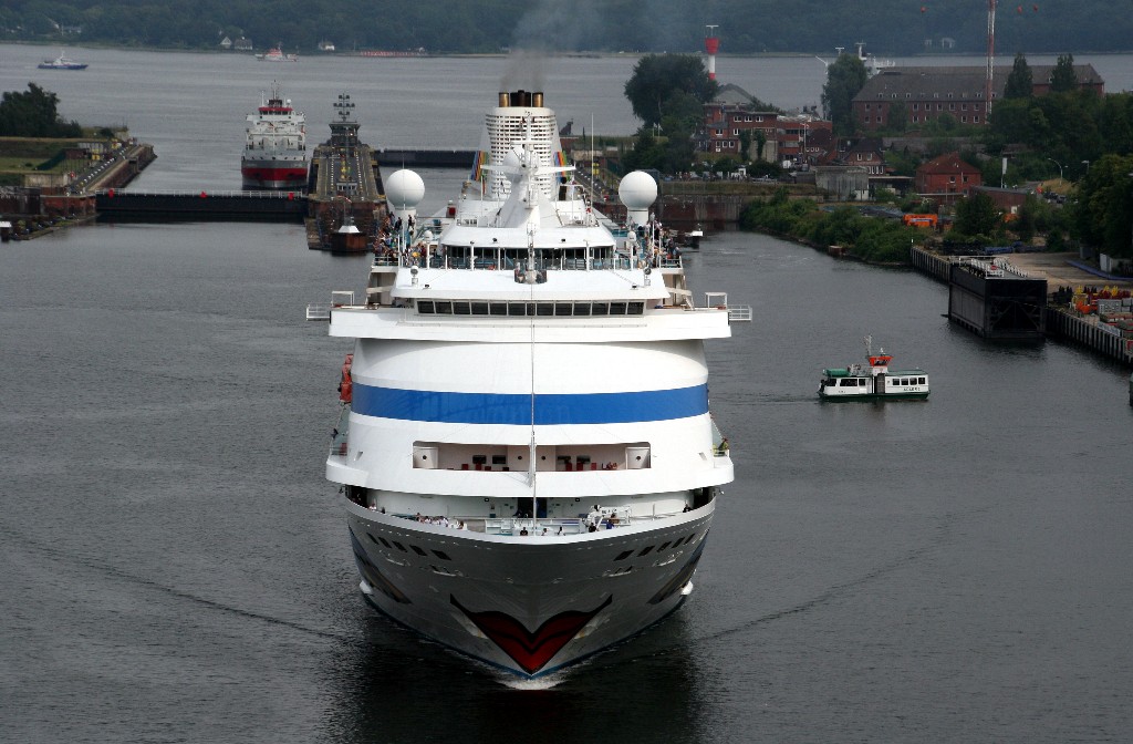 Die AIDAcara in der Südschleuse vom Nordostseekanal (das Schleusentor ist noch geschlossen)