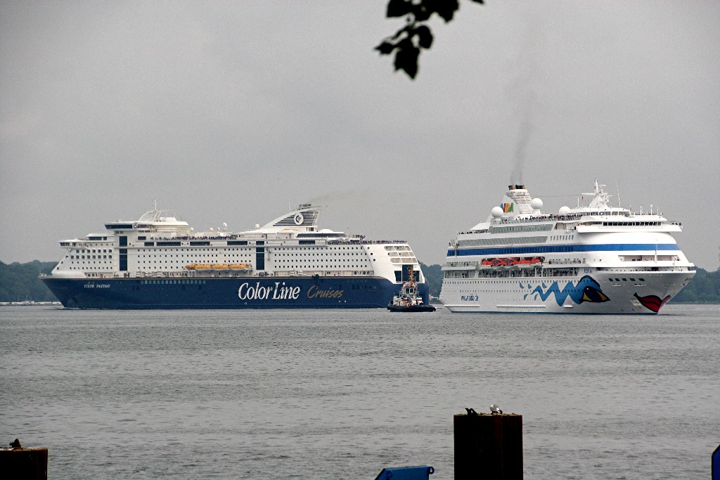 Die "Color Fantasy" fährt ihre Revierfahrt auf der "Kieler Förde" in Höhe der in Warteposition liegenden AIDAcara