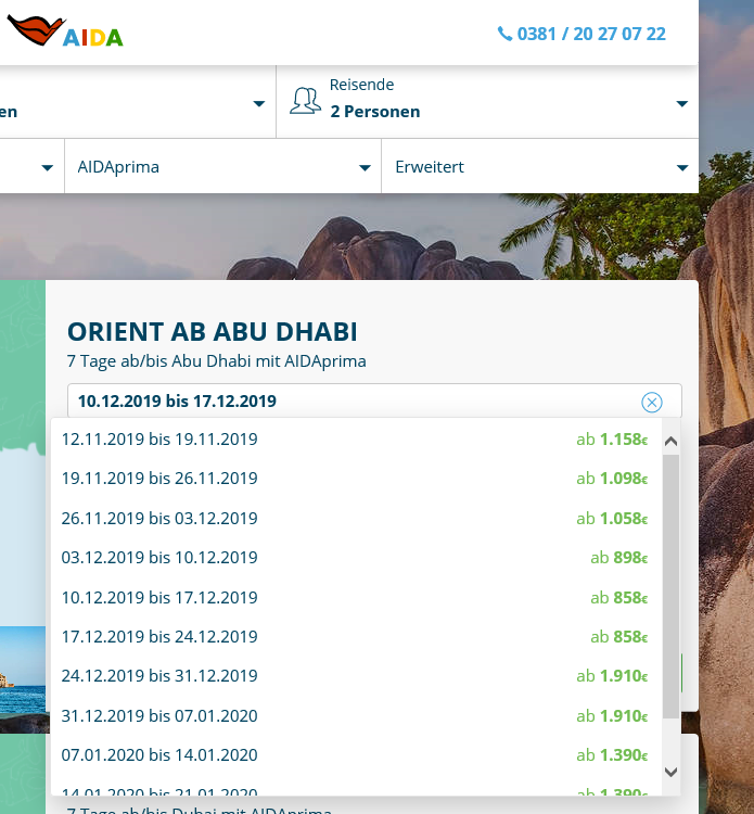 die Seite hier zeigt viele AIDA-Routen mit Verfügbarkeiten in Echtzeit.
