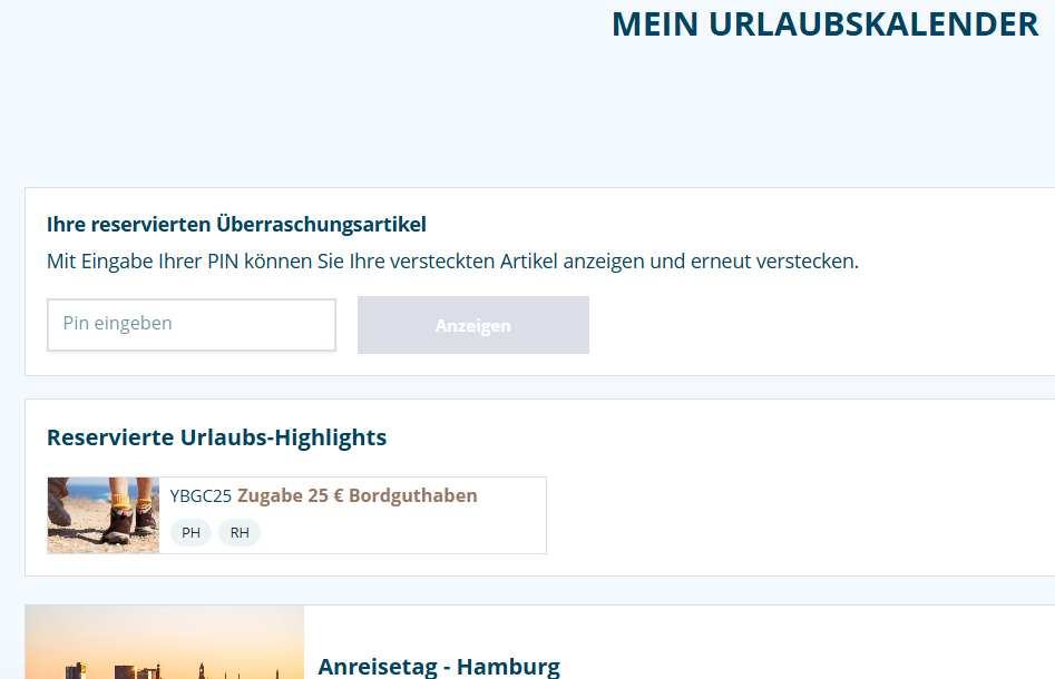 Aktuell zu Info: im Urlaubsplan steht für den zweiten Tag um 9:00h das Bordguthaben 2x50,- ohne weiteren Hinweis. Vermutlich der von der Aktion "Wintertraum". Für den Anreisetag stehen 2x50,- für die Bordbuchung. Also wie ursprünglich vorgesehen insgesamt 200,-€!