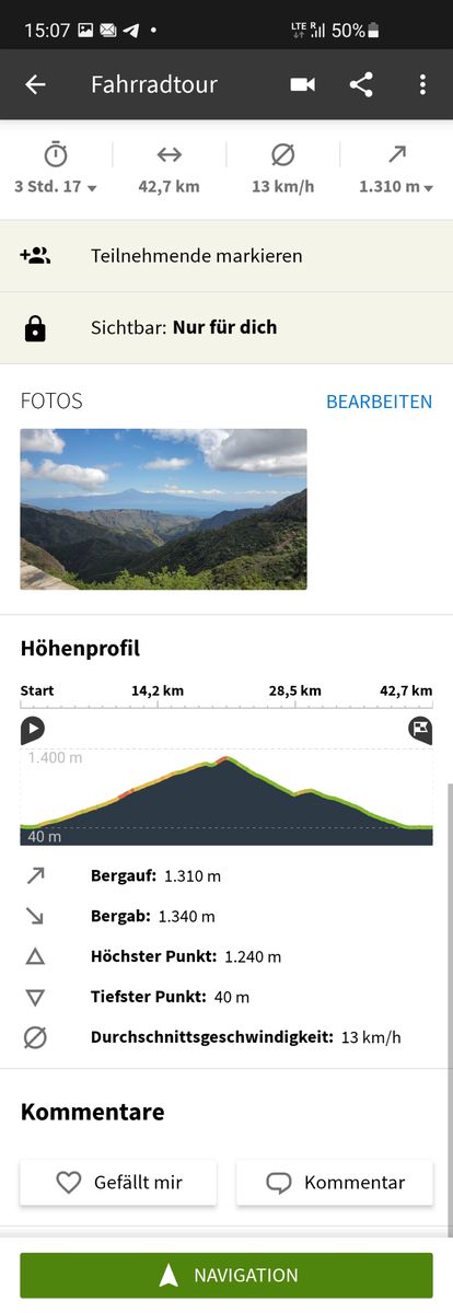 Die Tour startete natürlich direkt am Schiff und ging zunächst durch San Sebastian und dann die Straße GM-2 hoch. Wie hier schon bemerkt, geht es NUR bergauf. Nach etwa 1000hm Anstieg und diversen sehr schönen Miradores haben wir an der Bar Dellogada de Peraza Pause gemacht. Danach ging es über die berühmten Los Roques weiter hoch in den Nationalpark Garajonay, wo wir auf die Straße CV-14 einbogen. Inzwischen hatten wir etwa 1250hm und gute 20km hinter uns. Über den CV-14 ging es dann bergab bis zur Kreuzung mit dem GM-1, wieder vorbei an etlichen schönen Miradores, bei denen wir phantastische Panoramen erleben konnten. Auf dem GM-1 folgten dann die letzten 100hm Anstieg bis zum Tunnel ins Haupttal von San Sebastian. Von da aus ging es nur noch bergab, was echt Spaß gemacht hat. Am Ende standen knapp 43km und gute 1300hm auf der Uhr.