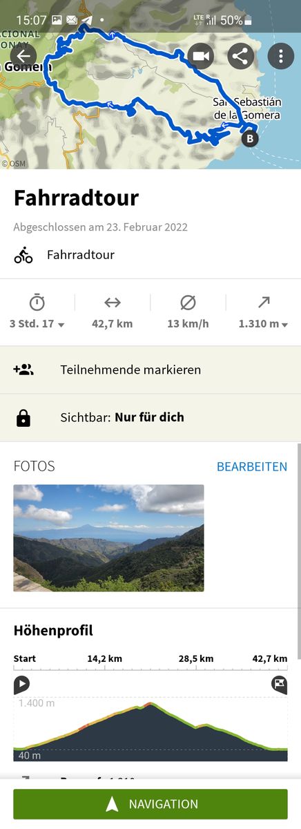 Die Tour startete natürlich direkt am Schiff und ging zunächst durch San Sebastian und dann die Straße GM-2 hoch. Wie hier schon bemerkt, geht es NUR bergauf. Nach etwa 1000hm Anstieg und diversen sehr schönen Miradores haben wir an der Bar Dellogada de Peraza Pause gemacht. Danach ging es über die berühmten Los Roques weiter hoch in den Nationalpark Garajonay, wo wir auf die Straße CV-14 einbogen. Inzwischen hatten wir etwa 1250hm und gute 20km hinter uns. Über den CV-14 ging es dann bergab bis zur Kreuzung mit dem GM-1, wieder vorbei an etlichen schönen Miradores, bei denen wir phantastische Panoramen erleben konnten. Auf dem GM-1 folgten dann die letzten 100hm Anstieg bis zum Tunnel ins Haupttal von San Sebastian. Von da aus ging es nur noch bergab, was echt Spaß gemacht hat. Am Ende standen knapp 43km und gute 1300hm auf der Uhr.