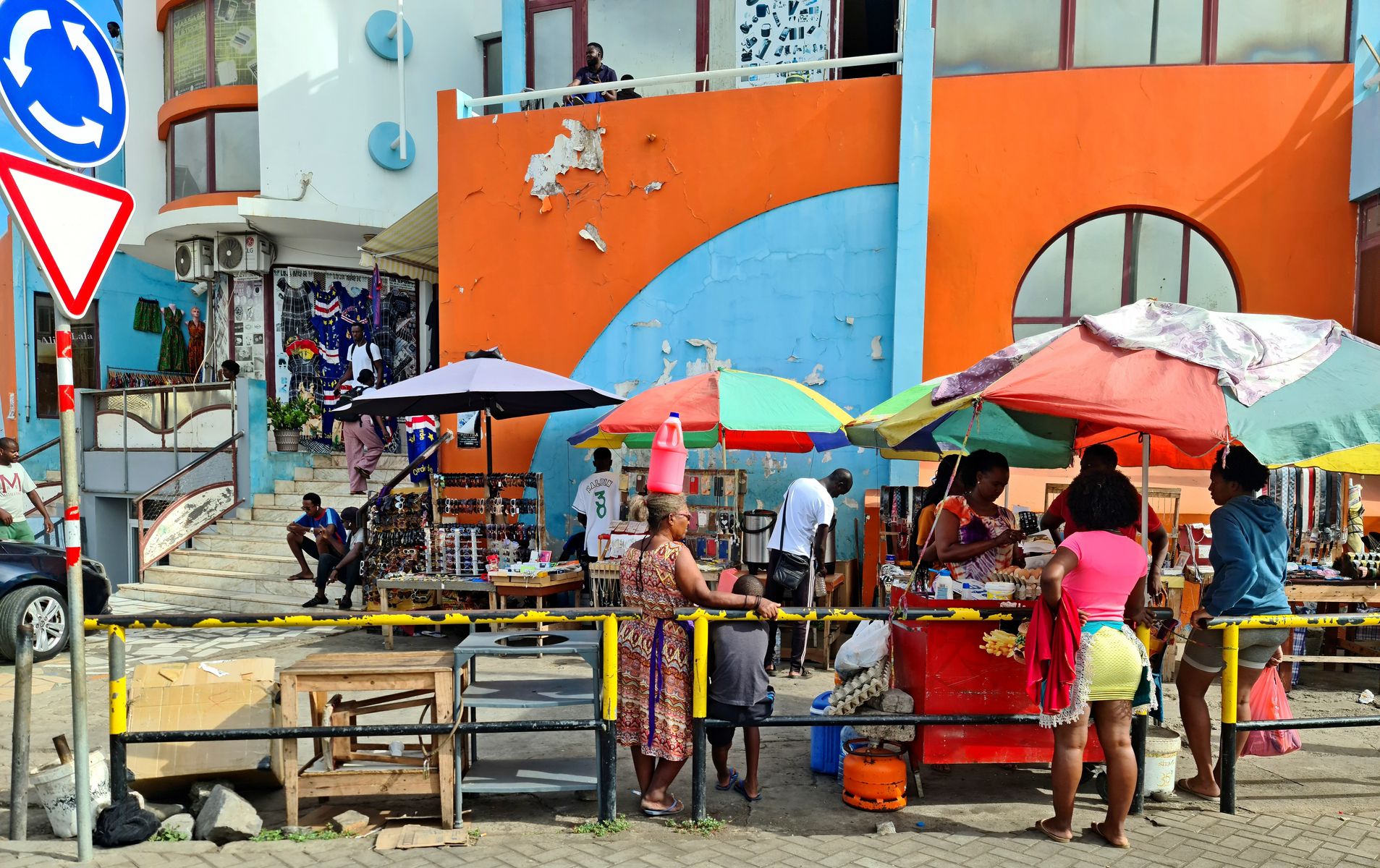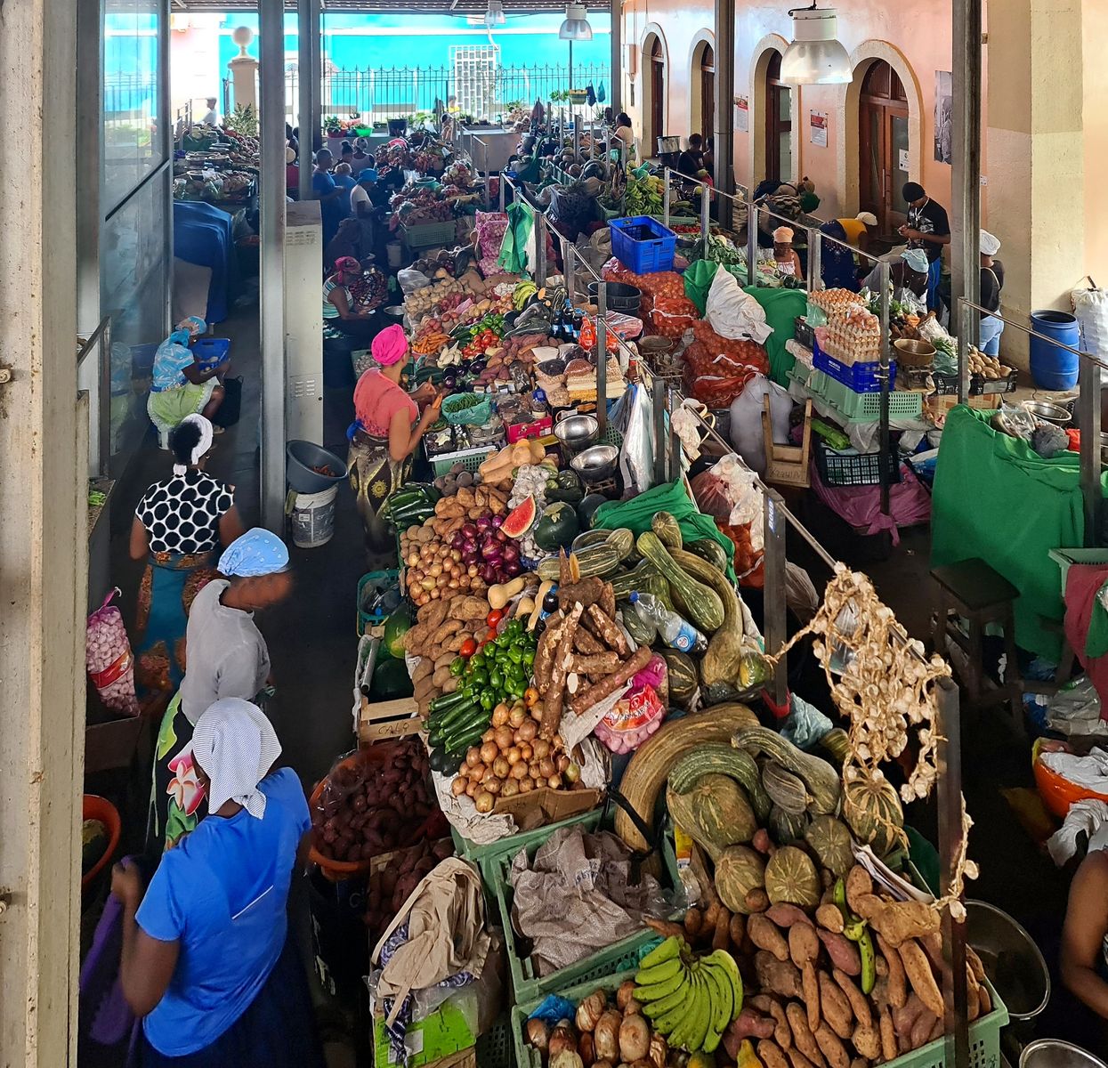 Die Tour ging mit einem Minibus zunächst nach Praia ins Regierungsviertel im Stadtteil Plato, wo wir einen von Roza gut erklärten Rundgang machten. Vorbei am Sitz des Präsidenten liefen wir dann direkt in eine Fußgängerzone, an der sich auch der Markt von Praia befindet. Der Marktrundgang war sehr interessant. Direkt fiel auf, dass das Warenangebot doch deutlich größer war als in Mindelo am Tag davor. Gehandelt wurden dort Agrarprodukte aller Art; von Obst und Gemüse über Kräuter und Öle bis hin zu Grundnahrungsmitteln wie Reis. Etliche Produkte, die wir hier in Europa nicht kennen, hat Roza auf dem Markt gezeigt und erklärt.