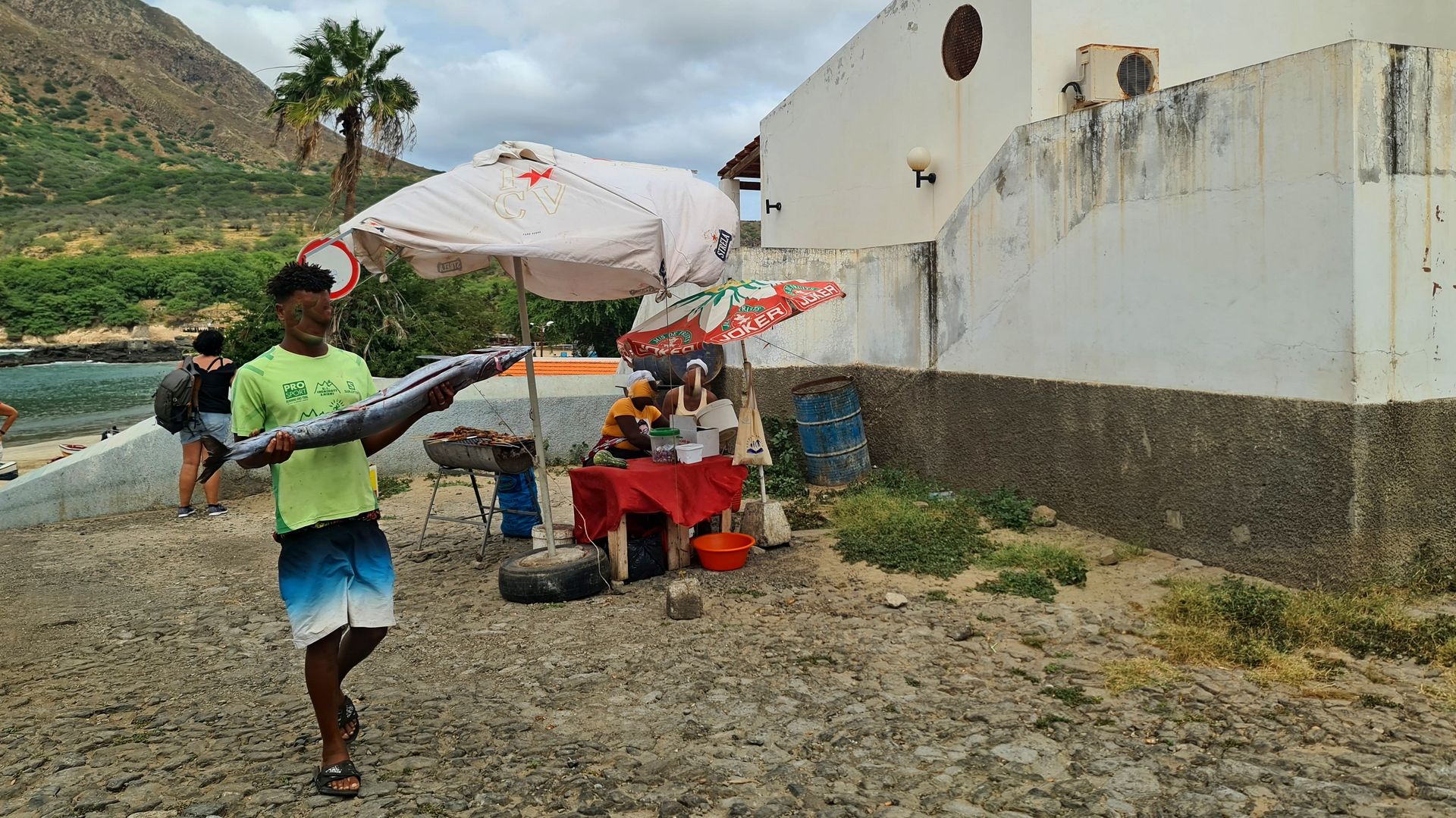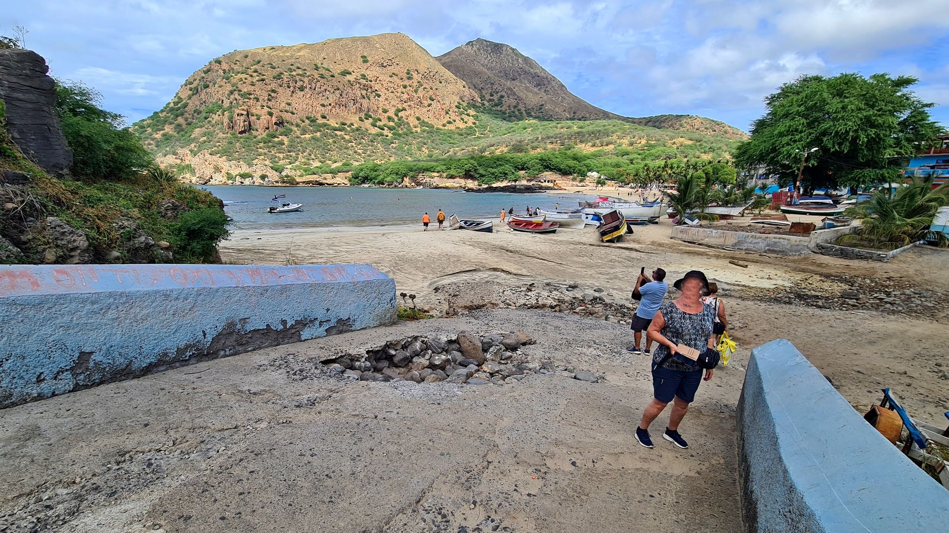 Danach ging es mit dem Minibus quer über die Insel. Die Fahrt zog sich leider ziemlich und die Erklärungen/ Erzählungen unterwegs wurden mit der Zeit immer weniger. Nach einigen Fotostopps erreichten wir dann knapp 2 Stunden später das Dorf Calheta. Während der Fahrt sahen wir unter anderem die Bergkette des Pico Antonia und fuhren durch ein Tal, in dem in verschiedenster Art Landwirtschaft betrieben wurde. In Calheta wurden wir in einem kleinen Restaurant zu diversen kapverdischen Kleinigkeiten empfangen. Essen und Getränke (auch Bier) waren im Preis inbegriffen. Die „Kleinigkeiten“ waren allesamt sehr schmackhaft (Obst, Käse, Teigtaschen und einiges mehr) und haben für uns das Mittagessen komplett ersetzt. Was auch schön war, war, dass uns erklärt wurde, was wir da vor uns haben und teilweise auch, wie es hergestellt wird. Nach der Pause fuhren wir weiter nach Tarrafal. Auch hier gab es wieder einige Fotostopps und Erklärungen zu dem, was es jeweils zu sehen gab. In Tarrafal waren wir dann nochmal eine gute Fahrstunde später. Dort gab es vor Ort leider keine Führung, sondern nur einen Hinweis auf zwei Strandbars und den weißen Strand mit den bunten Booten, den man in jedem Reiseführer findet. Neben seiner schrecklichen Geschichte (auf die Roza nur im Nebensatz einging), ist Tarrafal eine hübsche kleine Stadt mit einem traumhaften Strand. Der Ort macht einen touristisch wenig bis gar nicht erschlossenen Eindruck, was sich auch in den Preisen vor Ort widergespiegelt hat. So haben wir zu viert in der Strandbar für Wasser und Bier gerade mal umgerechnet 3,20 Euro bezahlt.