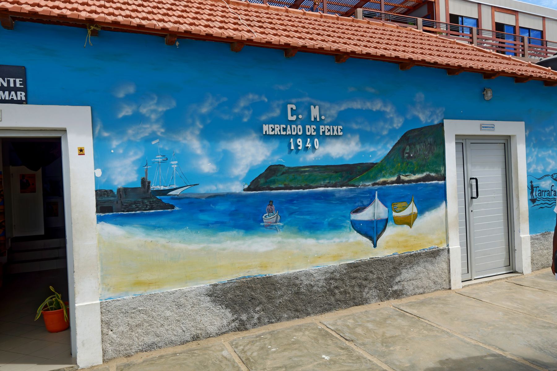 Danach ging es mit dem Minibus quer über die Insel. Die Fahrt zog sich leider ziemlich und die Erklärungen/ Erzählungen unterwegs wurden mit der Zeit immer weniger. Nach einigen Fotostopps erreichten wir dann knapp 2 Stunden später das Dorf Calheta. Während der Fahrt sahen wir unter anderem die Bergkette des Pico Antonia und fuhren durch ein Tal, in dem in verschiedenster Art Landwirtschaft betrieben wurde. In Calheta wurden wir in einem kleinen Restaurant zu diversen kapverdischen Kleinigkeiten empfangen. Essen und Getränke (auch Bier) waren im Preis inbegriffen. Die „Kleinigkeiten“ waren allesamt sehr schmackhaft (Obst, Käse, Teigtaschen und einiges mehr) und haben für uns das Mittagessen komplett ersetzt. Was auch schön war, war, dass uns erklärt wurde, was wir da vor uns haben und teilweise auch, wie es hergestellt wird. Nach der Pause fuhren wir weiter nach Tarrafal. Auch hier gab es wieder einige Fotostopps und Erklärungen zu dem, was es jeweils zu sehen gab. In Tarrafal waren wir dann nochmal eine gute Fahrstunde später. Dort gab es vor Ort leider keine Führung, sondern nur einen Hinweis auf zwei Strandbars und den weißen Strand mit den bunten Booten, den man in jedem Reiseführer findet. Neben seiner schrecklichen Geschichte (auf die Roza nur im Nebensatz einging), ist Tarrafal eine hübsche kleine Stadt mit einem traumhaften Strand. Der Ort macht einen touristisch wenig bis gar nicht erschlossenen Eindruck, was sich auch in den Preisen vor Ort widergespiegelt hat. So haben wir zu viert in der Strandbar für Wasser und Bier gerade mal umgerechnet 3,20 Euro bezahlt.