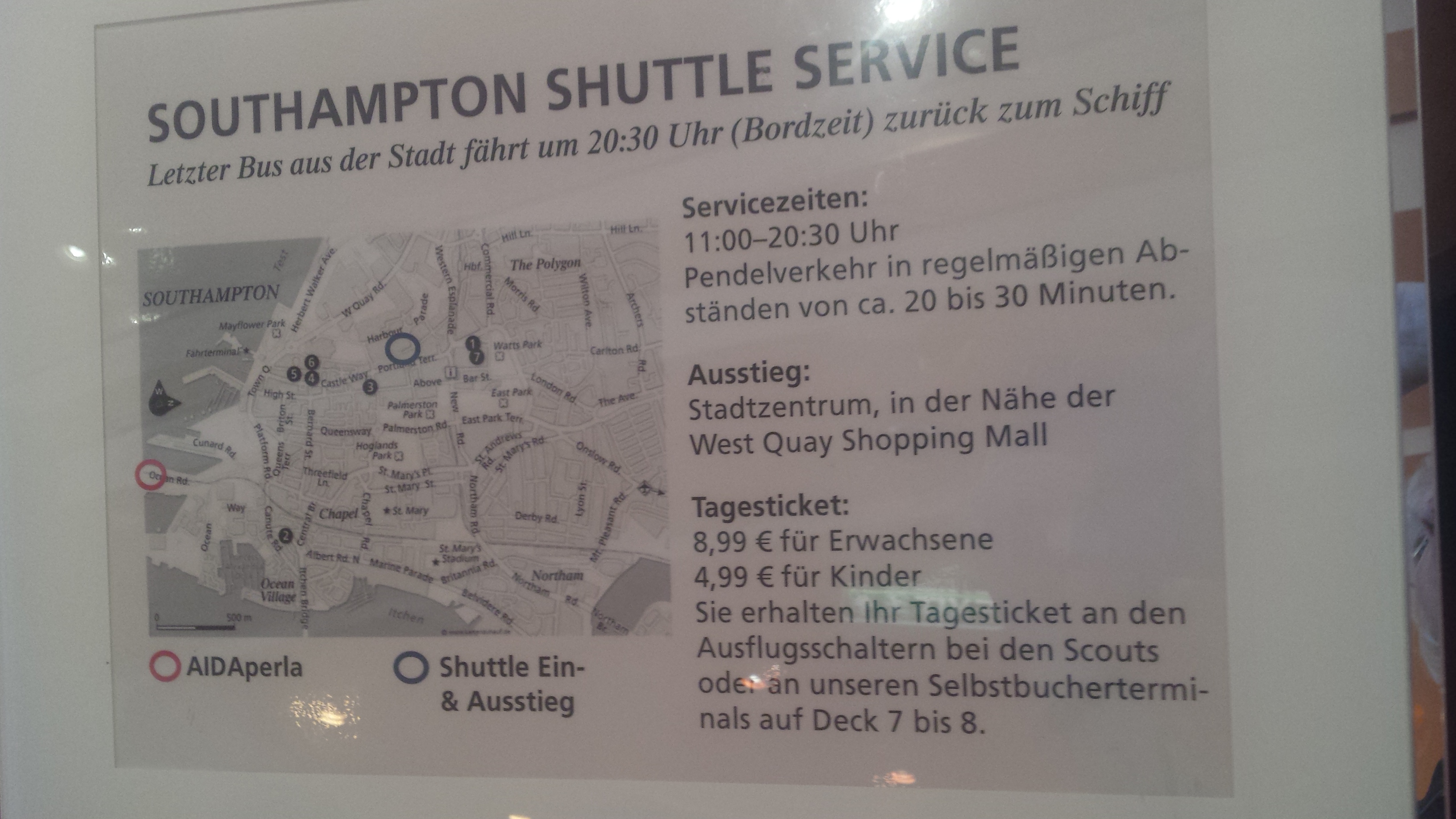 das ist der Aida Shuttle, oder? Der von southampton kostet nichts und hat 2 Haltestellen... aber wielang dieser fährt, weiß ich leider nicht...