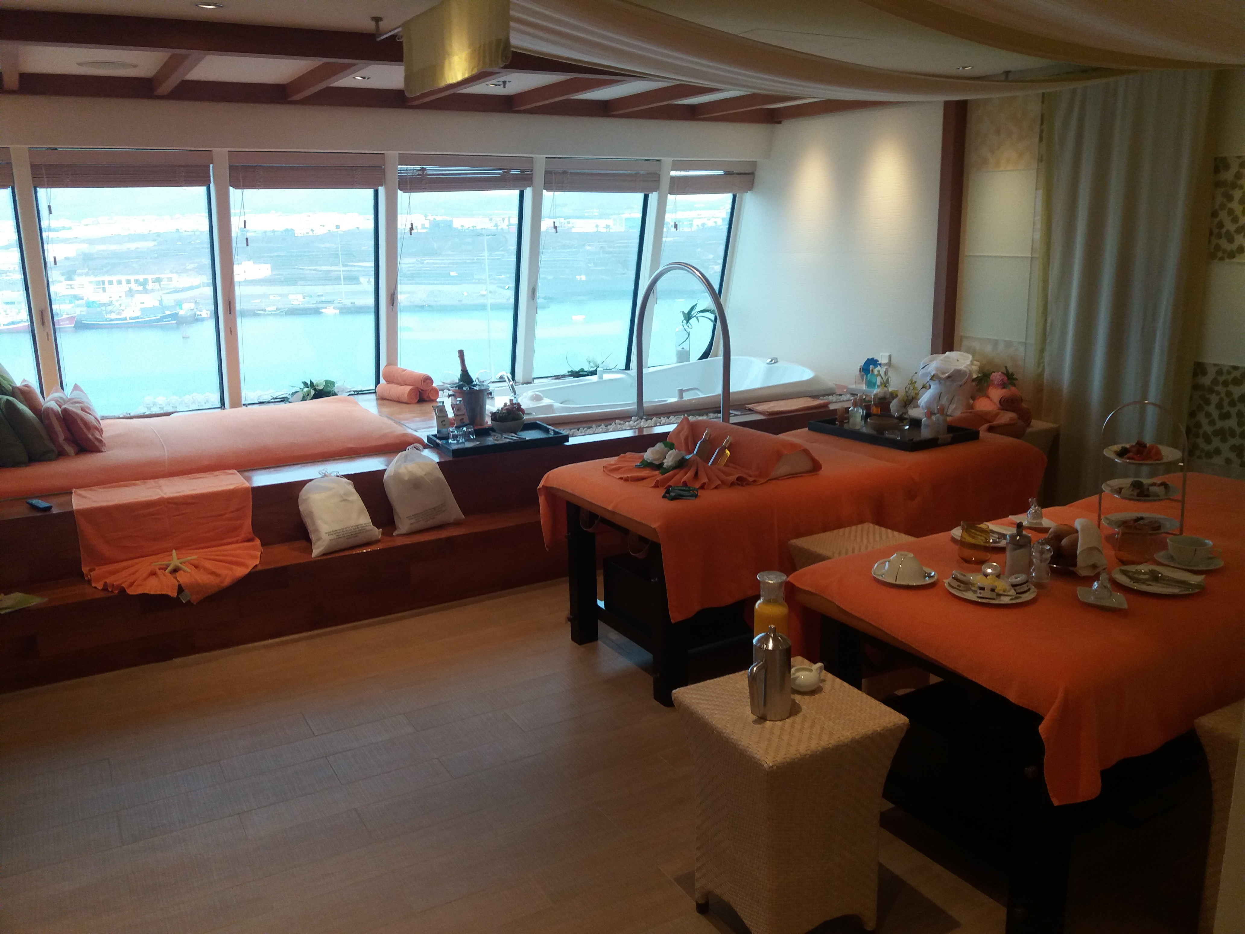 Wir buchen immer die Wellness-Suite. Je nach Reisedauer 1-2 mal und meistens morgens an Seetagen. Ab 8.30 Uhr ist auch ein Frühstück mit dabei.