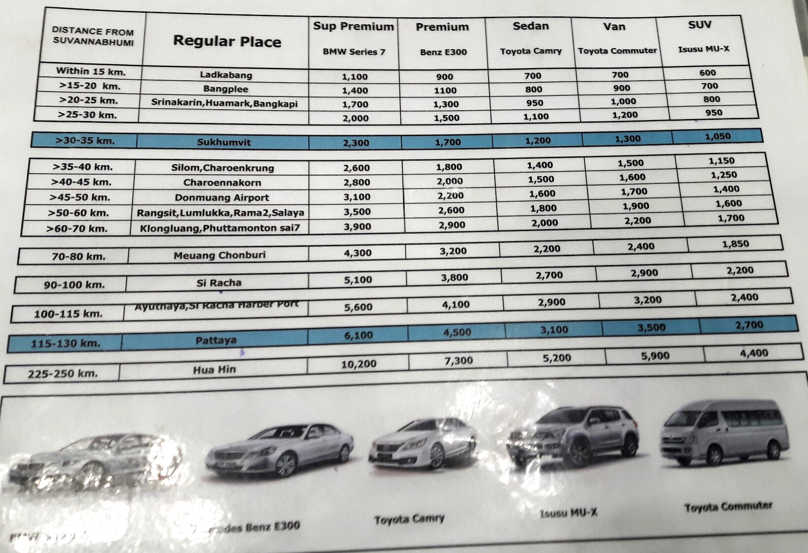 Wer nichts gebucht hat, kann auch einfach nach der Ankunft an den Gepäckbändern zum AOT Schalter gehen und sich dort eine Limo nehmen. Am günstigsten (aber mit viel Platz für's Gepäck) ist ein Isuzu MU-X. Der kostet nach Downtown Bangkok THB 1050,- Endpreis.