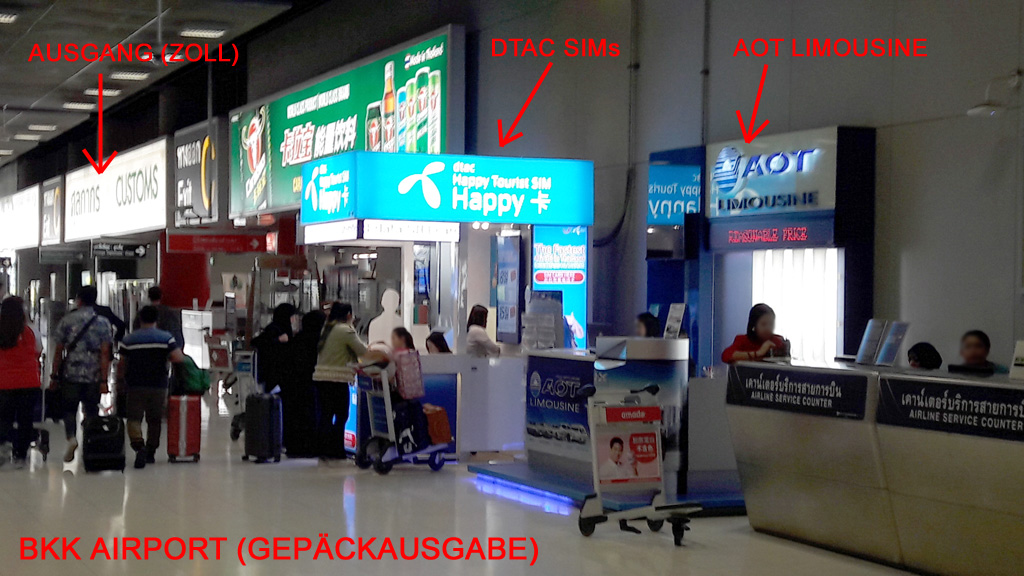 Wer kein Transportmittel gebucht hat, kann auch einfach nach der Ankunft in BKK in der Halle mit den Gepäckbändern zu einem der vielen AOT Schalter gehen und sich dort eine Limo nehmen. Am günstigsten (aber mit viel Platz für's Gepäck) ist ein SUV Isuzu MU-X. Der kostet nach Downtown Bangkok THB 1050,- Endpreis (etwa .€27,-). Eine vorherige Reservierung ist nicht notwendig.
