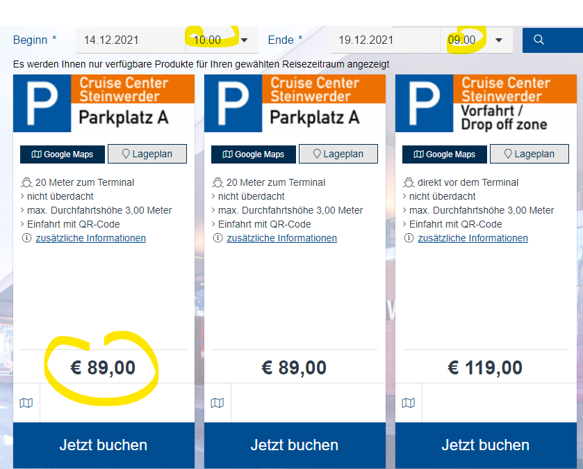 Wenn man direkt beim Anbieter bucht, entfällt genau dieses Prozedere. Einfach vom Schiff zum Auto gehen und losfahren. Es ist der gleiche Anbieter, den auch Aida nimmt und damit genau die gleichen Parkplätze. Ich war im September um 10 Uhr vor Ort und habe direkt 50m vorm Eingang zum Terminal geparkt.