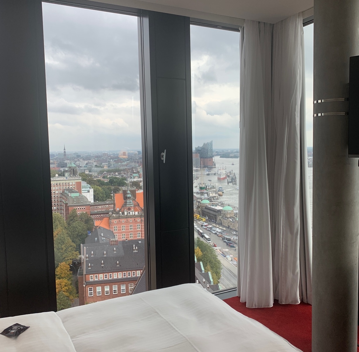 Im Empire Riverside haben wir immer den Riverview (nicht Riverside!) Corner Room gebucht. Das ist etwas weiter die Elbe hoch, bietet aber auch den Blick nach Steinwerder. Hier siehst Du am rechten Bildrand die AIDAvita, wie sie gerade nach Steinwerder abbiegt.