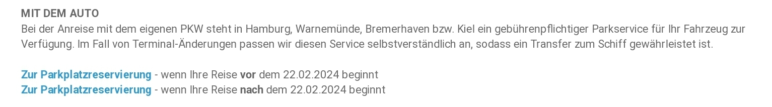 Würde ich jetzt so deuten das bei Reisen vor dem 22.02.2024 der Parkplatz wie bisher buchbar ist und bei Reisen nach dem 22.02.2024 ist die Parkplatzbuchung unter "Kabinen Upgrade & Anreise"