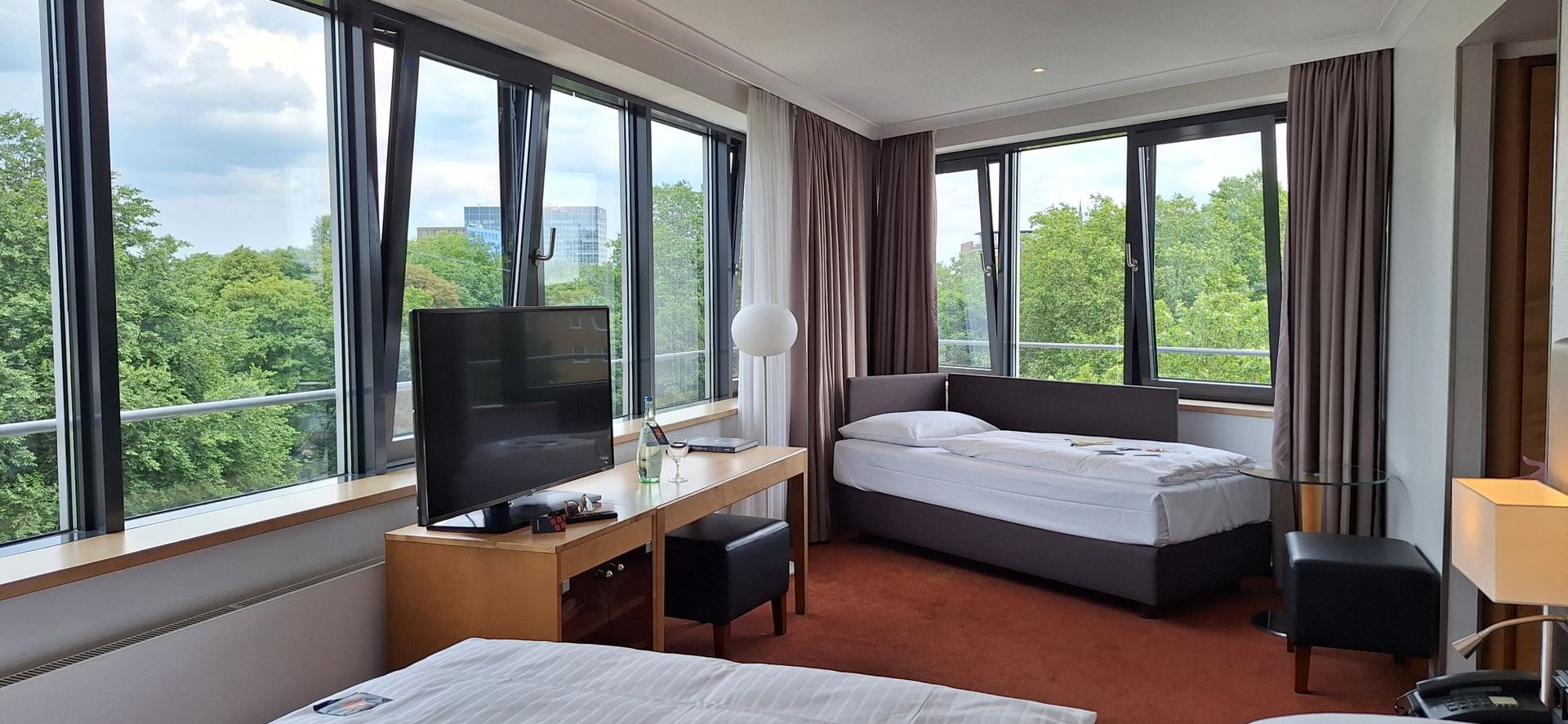 Wir hatten ein Familienzimmer im Neubau. Das Zimmer war einfach genial. Richtig schön groß mit rundum Blick auf die Tanzenden Türme, den Michel, die Elphi, auf die Landungsbrücken und die Elbe und dann sogar auf Steinwerder.