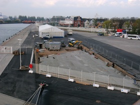 Blick von Bord der AIDAdiva auf die Baustelle am Pier 8