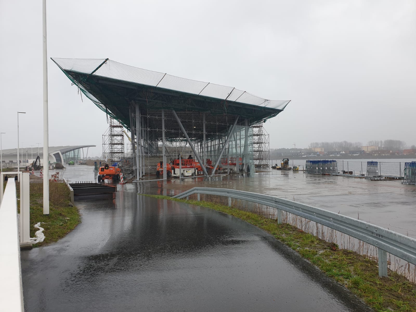 Das Dach ist nun auch drauf, momentan wird die Glasfassade (immerhin 1900 Quadratmeter Sicherheitsglas) geschlossen...