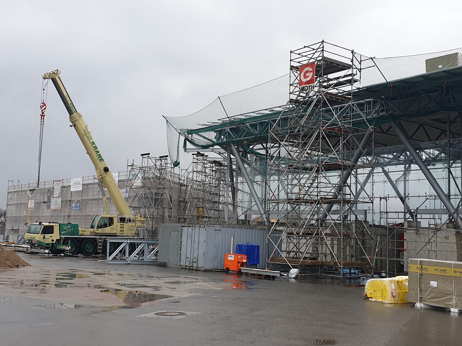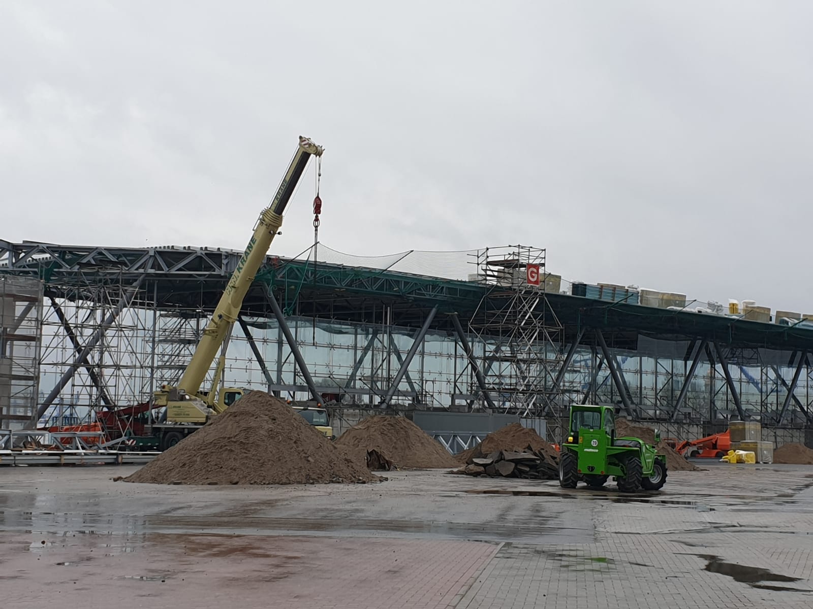 Das Dach ist nun auch drauf, momentan wird die Glasfassade (immerhin 1900 Quadratmeter Sicherheitsglas) geschlossen...