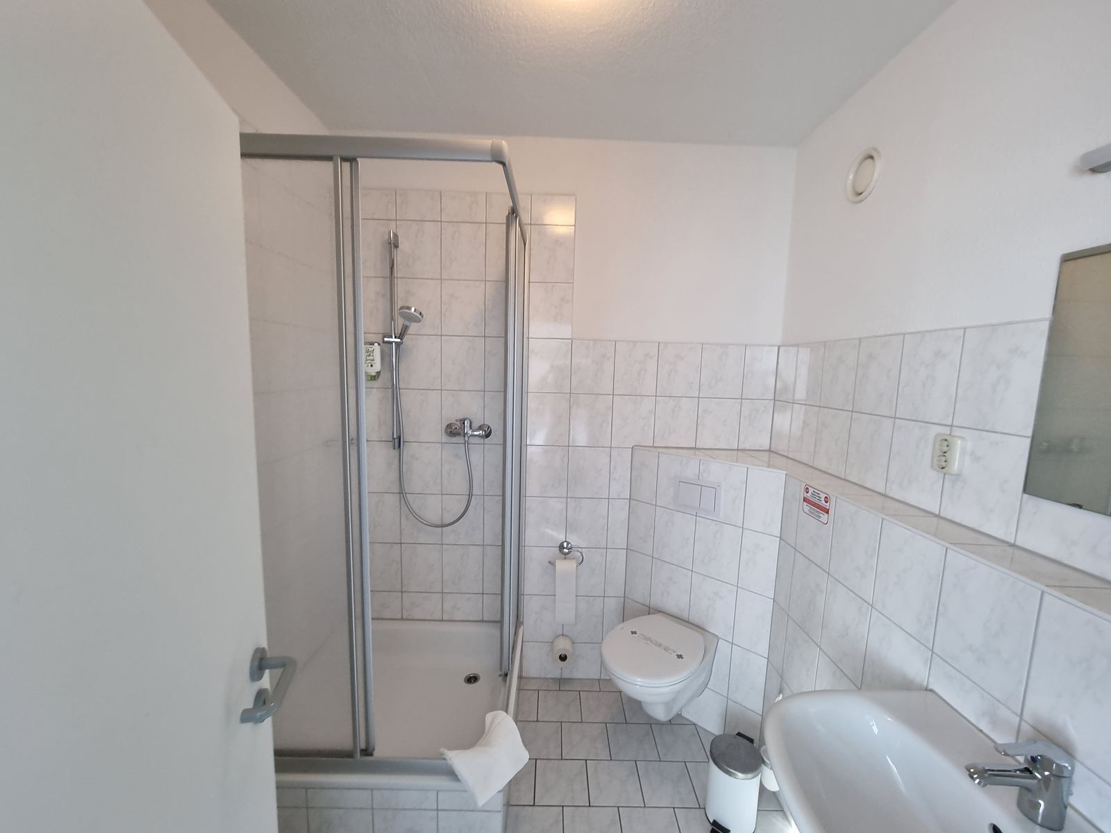 2er Zimmer für mich alleine, recht groß und großes Bad mit Dusche, WC und Waschbecken, inkl. Duschzeug und Seife und große und kleine Handtücher, kein Fön.