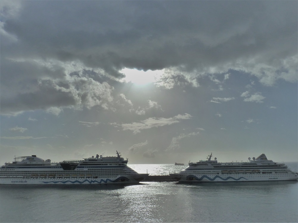 Ja wir waren auf der Sol dabei. Beim Einlaufen in Santa Cruz auf Teneriffa klickten die Apparate. Prima und Vita lagen schon im Hafen. Eigentlich hatte ich mit mehr „ Action“ der Passagiere vorgestellt. Es war doch noch sehr ruhig auf den anderen Schiffen. Das kannte ich von anderen Treffen ganz anders.