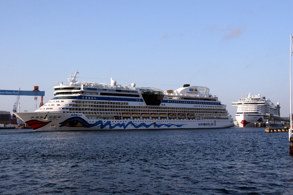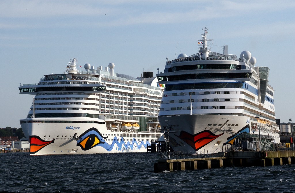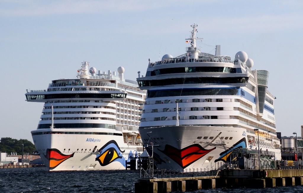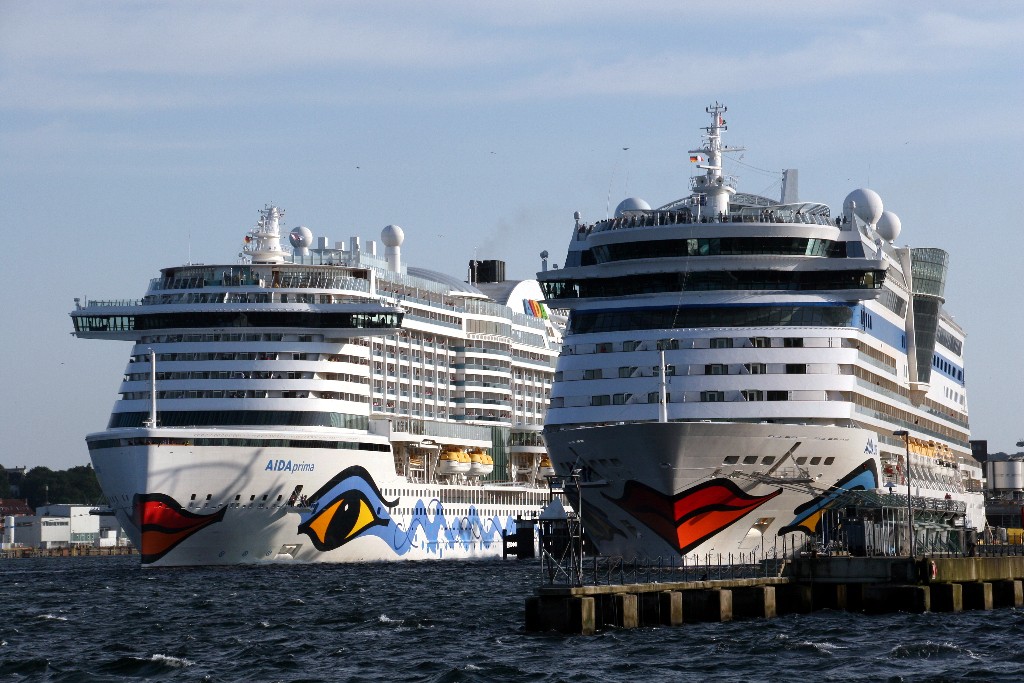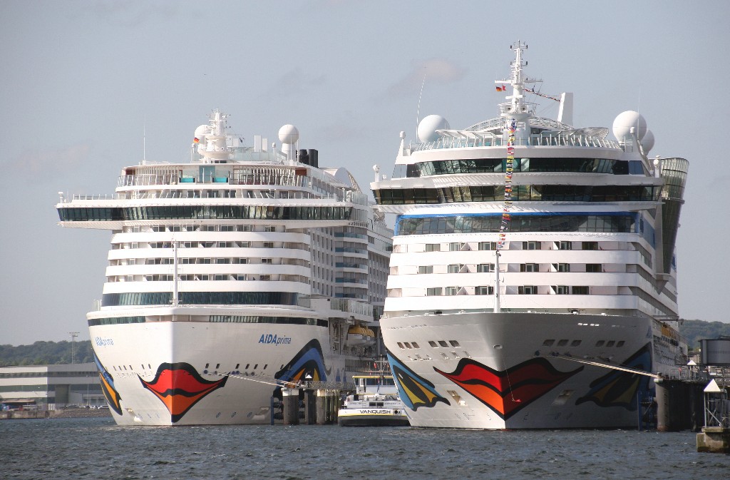 Die AIDAprima am Liegeplatz 27 und die AIDAluna am Liegeplatz 28 vom Ostseekai in Kiel