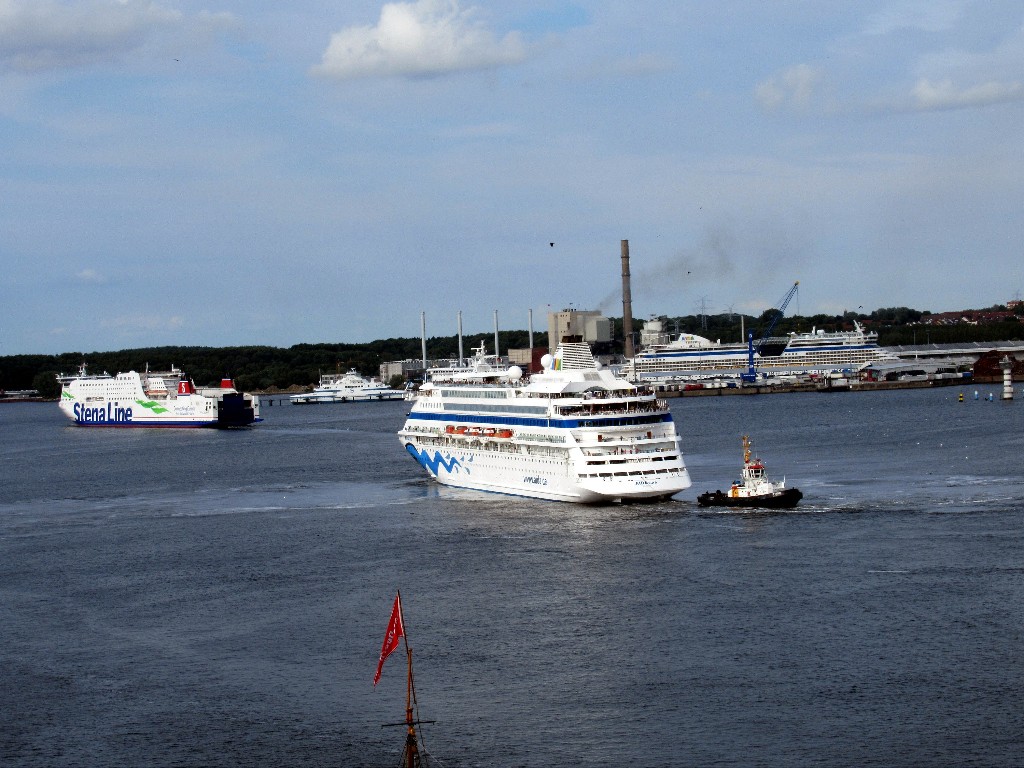 Ich war heute schon um 09:00h mit einem Hafenschlepper auf der Kieler Förde unterwegs und habe mir die AIDAcara und AIDAbella von der Wasserseite unter einem azurblauen Himmel am Ostseekai angesehen