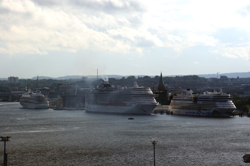 beim Schwesterntreffen am 25.08.2018 liegt die riesige MSC Preziosa zwischen der AIDAaura und der AIDAluna im Kieler Hafen