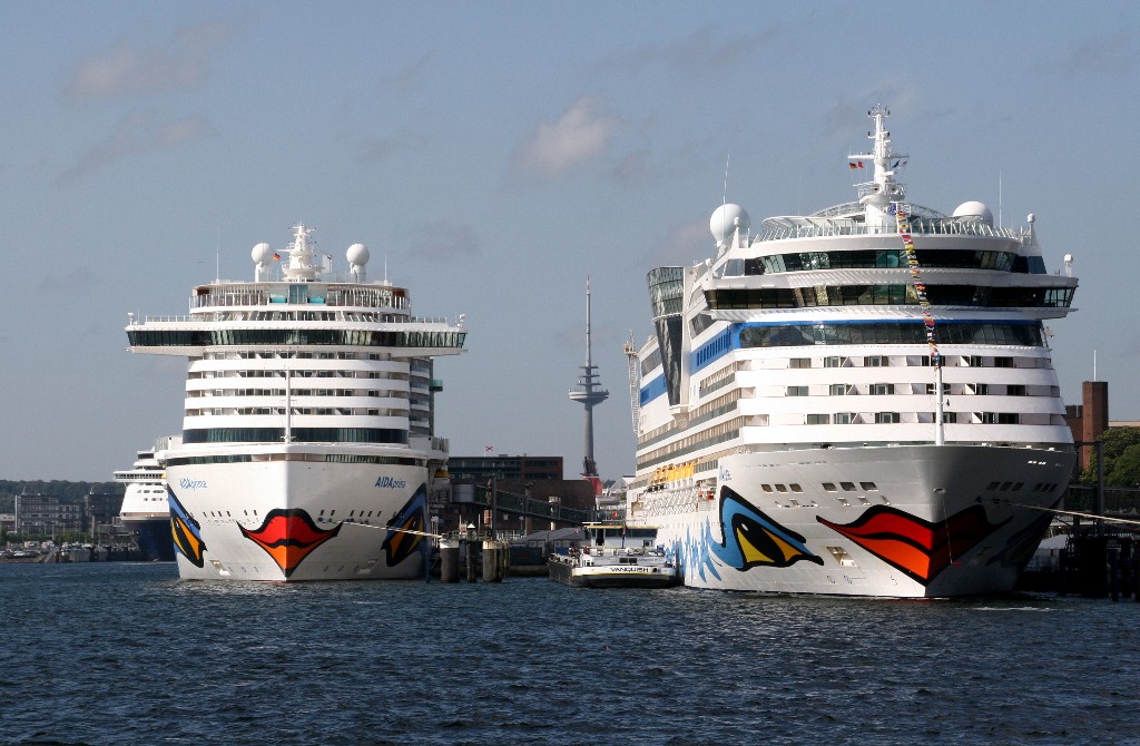 Die AIDAprima am Liegeplatz 27 und die AIDAluna am Liegeplatz 28 vom Ostseekai in Kiel