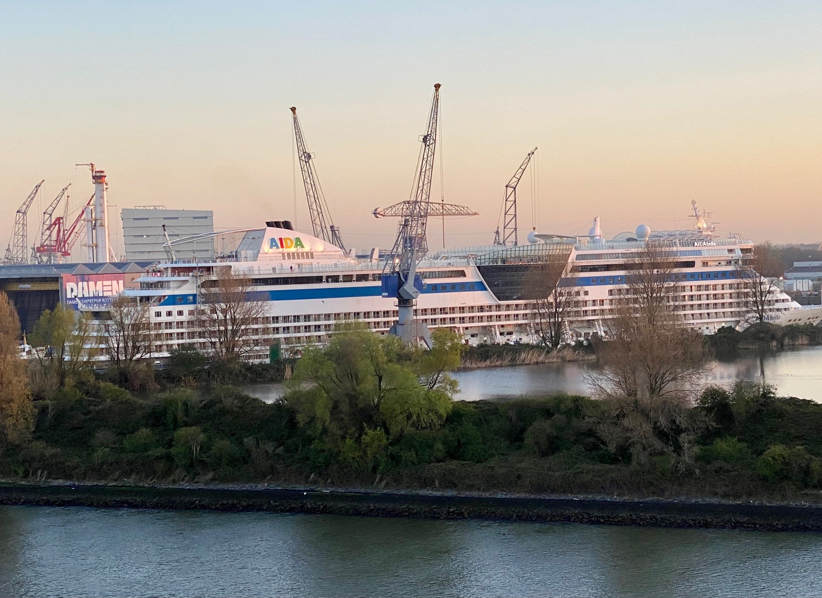 Abfahrt aus Rotterdam und noch ein kurzer Moment mit der kleinen Schwester Bella 🤩 Wir sind gerade mit der Prima an der seit gestern Abend im Dock liegenden AIDAbella vorbeigefahren. Sie liegt in der Werft Damen Shiprepair