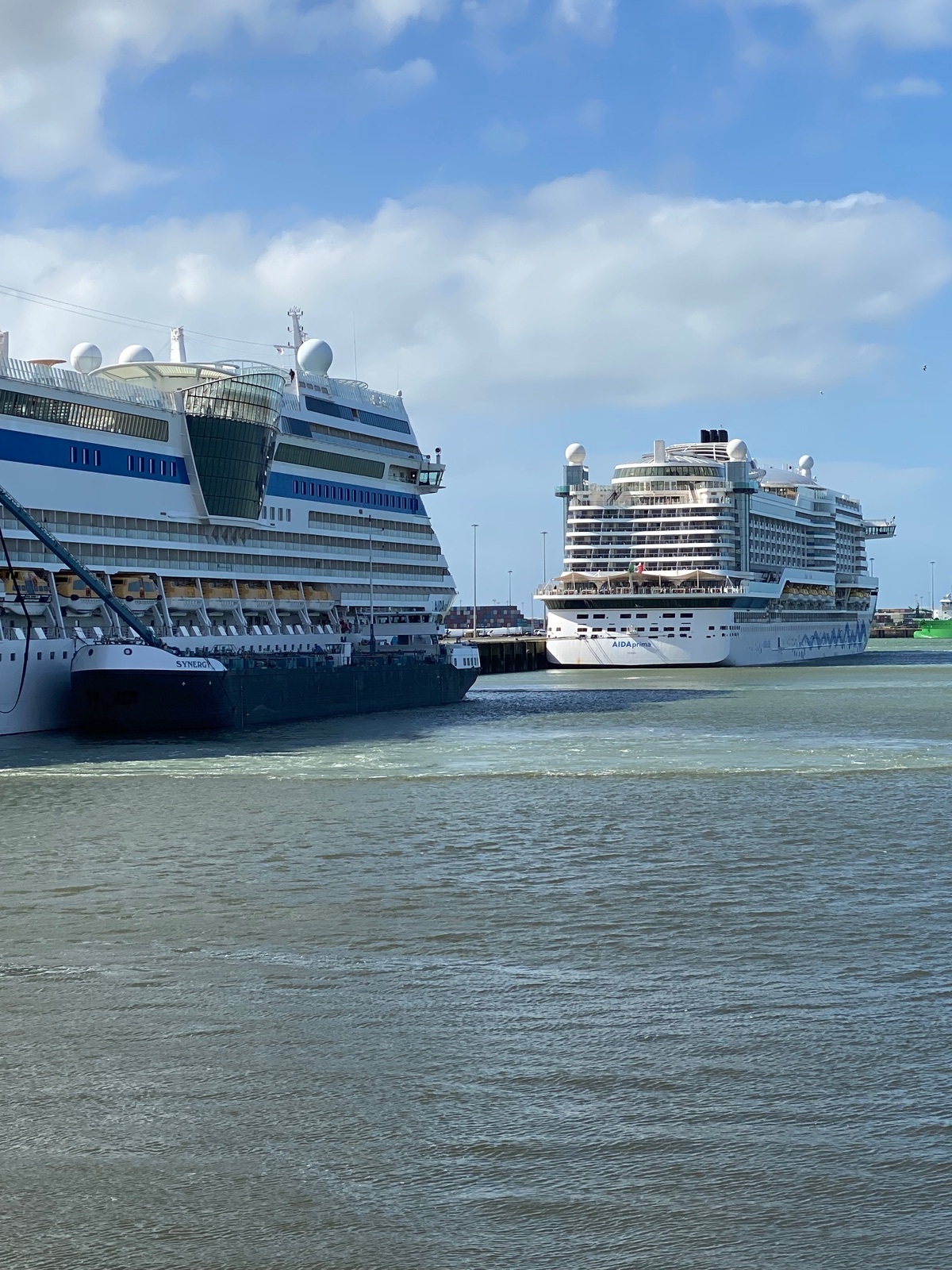 Abfahrt aus Rotterdam und noch ein kurzer Moment mit der kleinen Schwester Bella 🤩 Wir sind gerade mit der Prima an der seit gestern Abend im Dock liegenden AIDAbella vorbeigefahren. Sie liegt in der Werft Damen Shiprepair
