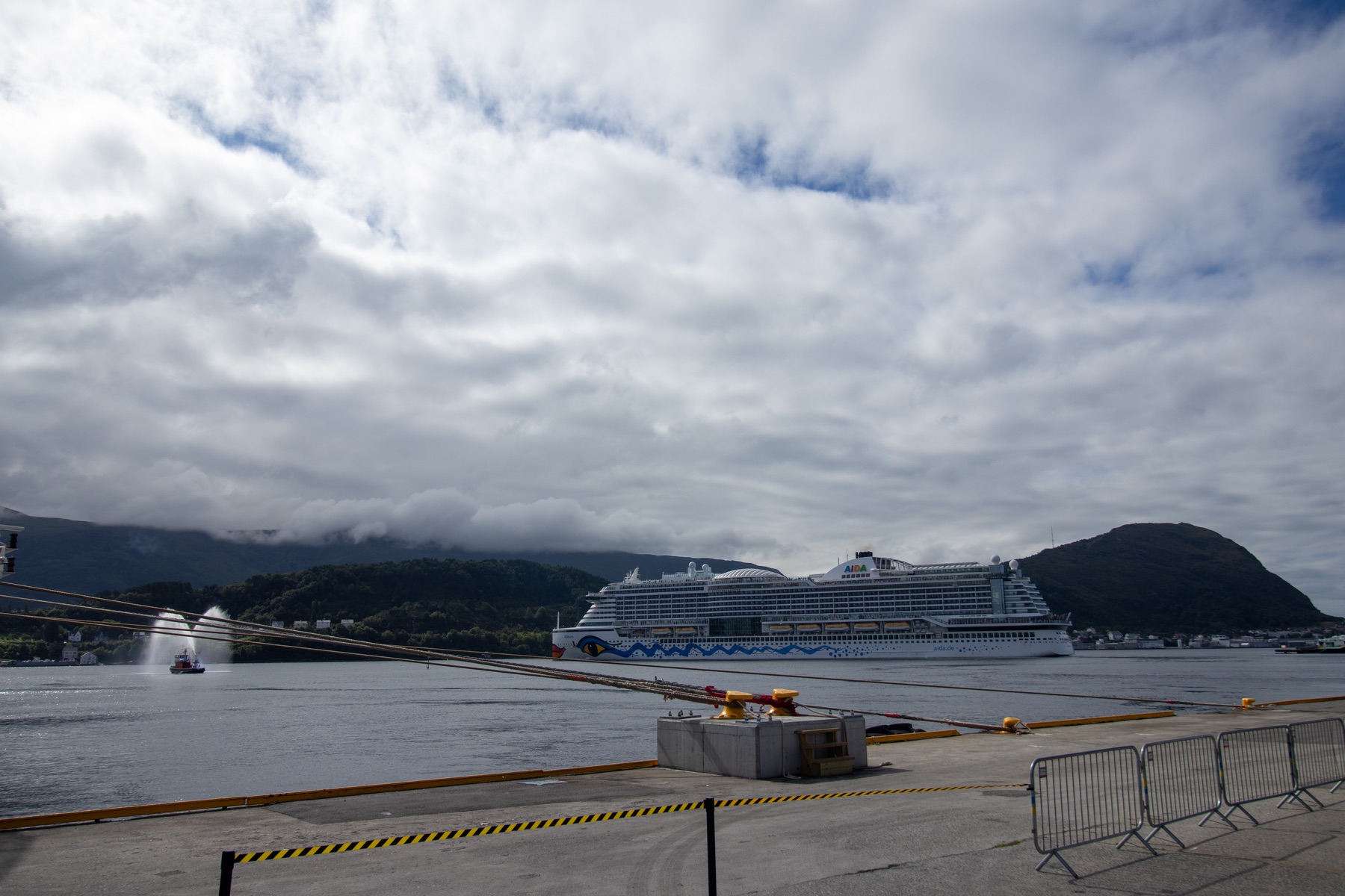 Ich habe mich sehr darauf gefreut, beide Schwestern vom Aksla abzulichten. Leider machte mir der Fahrplan der Perla (mit dem ich mich zuvor nicht beschäftigt habe) einen Strich durch die Rechnung. Pünktlich nach Verlassen der Sol um 13:00 Uhr ertönte ihr Typhon (wir haben schon einen Schreck bekommen) und die Perla wurde mit Löschbooten und etwas Böllern verabschiedet: