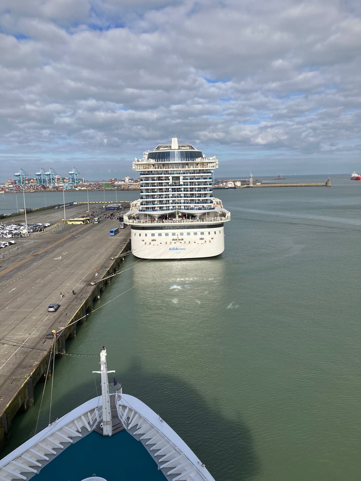 AIDAdiva und AIDAnova liegen heute zusammen in Zeebrügge. Hier ein Blick von der diva auf die nova: