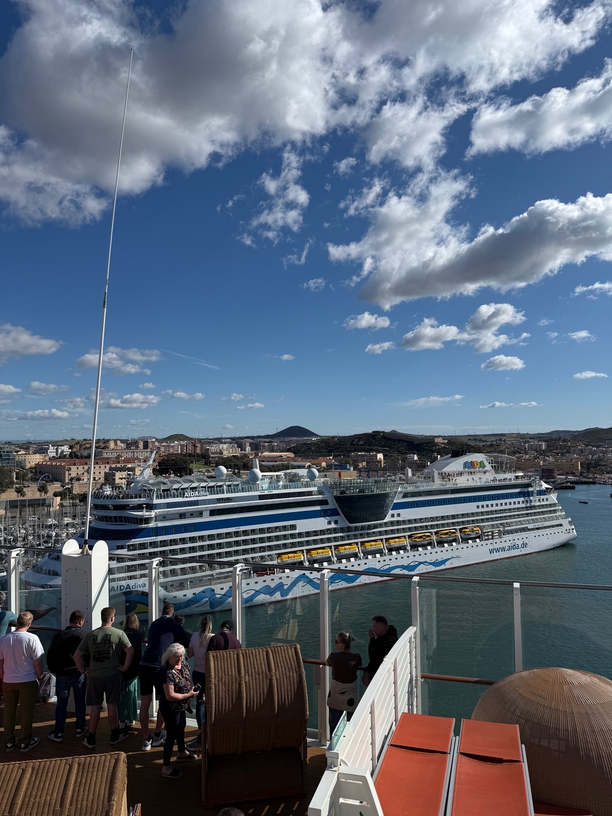 Wir waren auf unserem Rundgang in der AIDA Lounge und da habe ich gesehen, das ein Kreuzfahrtschiff weit entfernt ist. Erst später beim durchschauen der Bilder habe ich gesehen, dass es eine AIDA ist. Da war es zu spät, um hochzugehen und ein besseres Foto zu bekommen