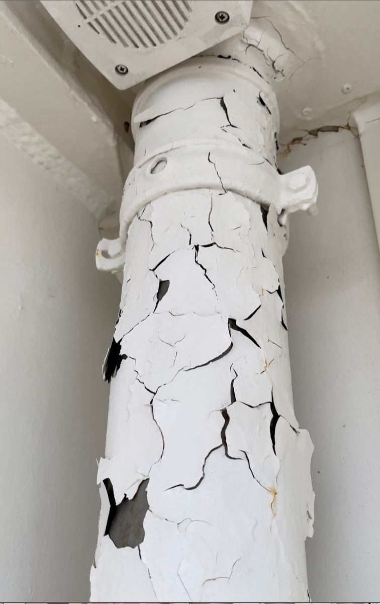 Am "Plätscherrohr" und auch an der Decke blätterte die Farbe in großen Lagen ab.