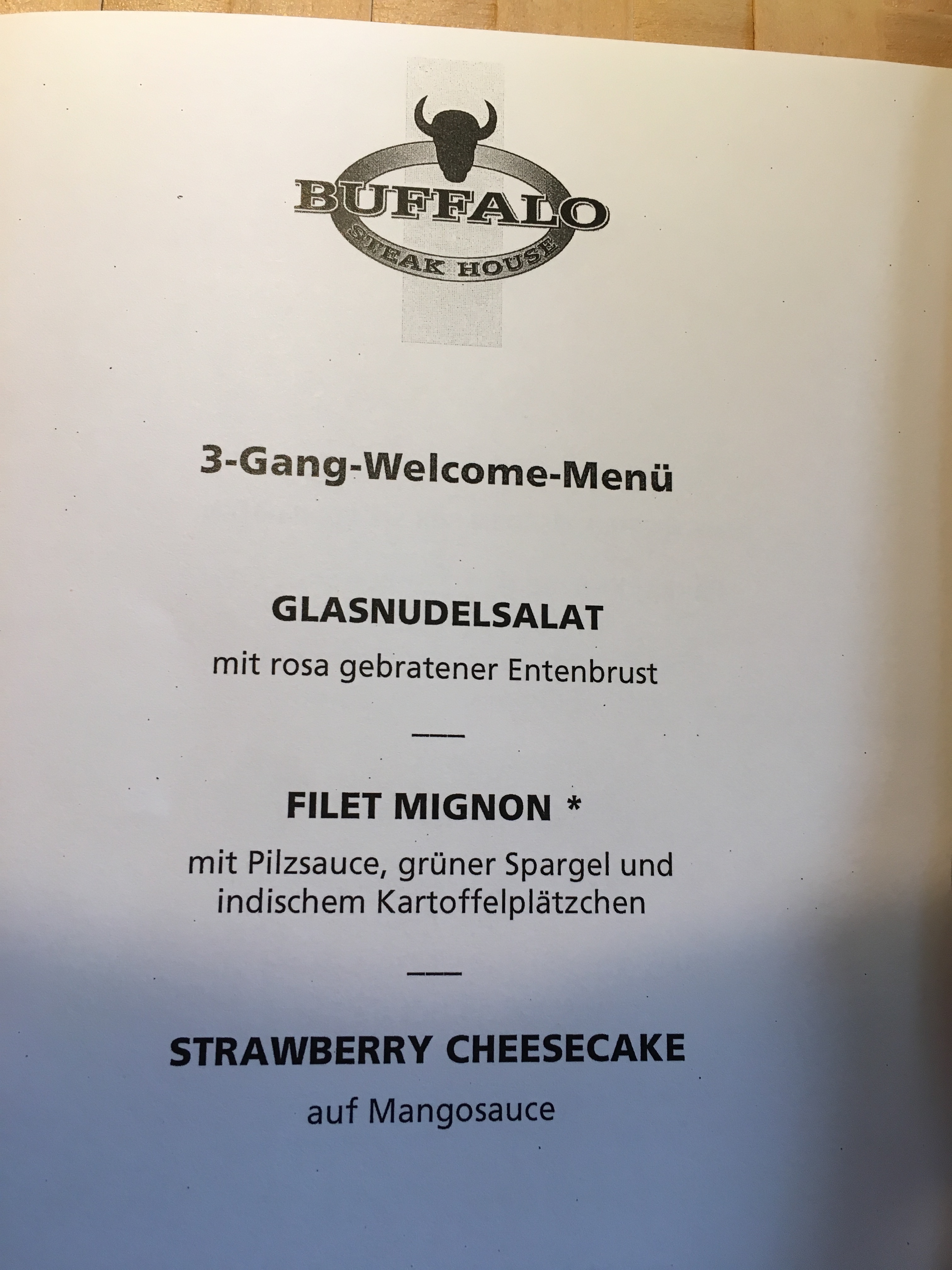 Wir durften dann am nächsten Tag kommen. Das Menü war okay, aber es war eine recht abgespeckte Variante eines Essens im Steakhaus und ich durfte den Nachtisch auch nicht tauschen. Fazit: Da besuche ich das Bufallo lieber regulär und zahle den vollen Preis, die weiteren Besuche dort waren dann nämlich alle gut.