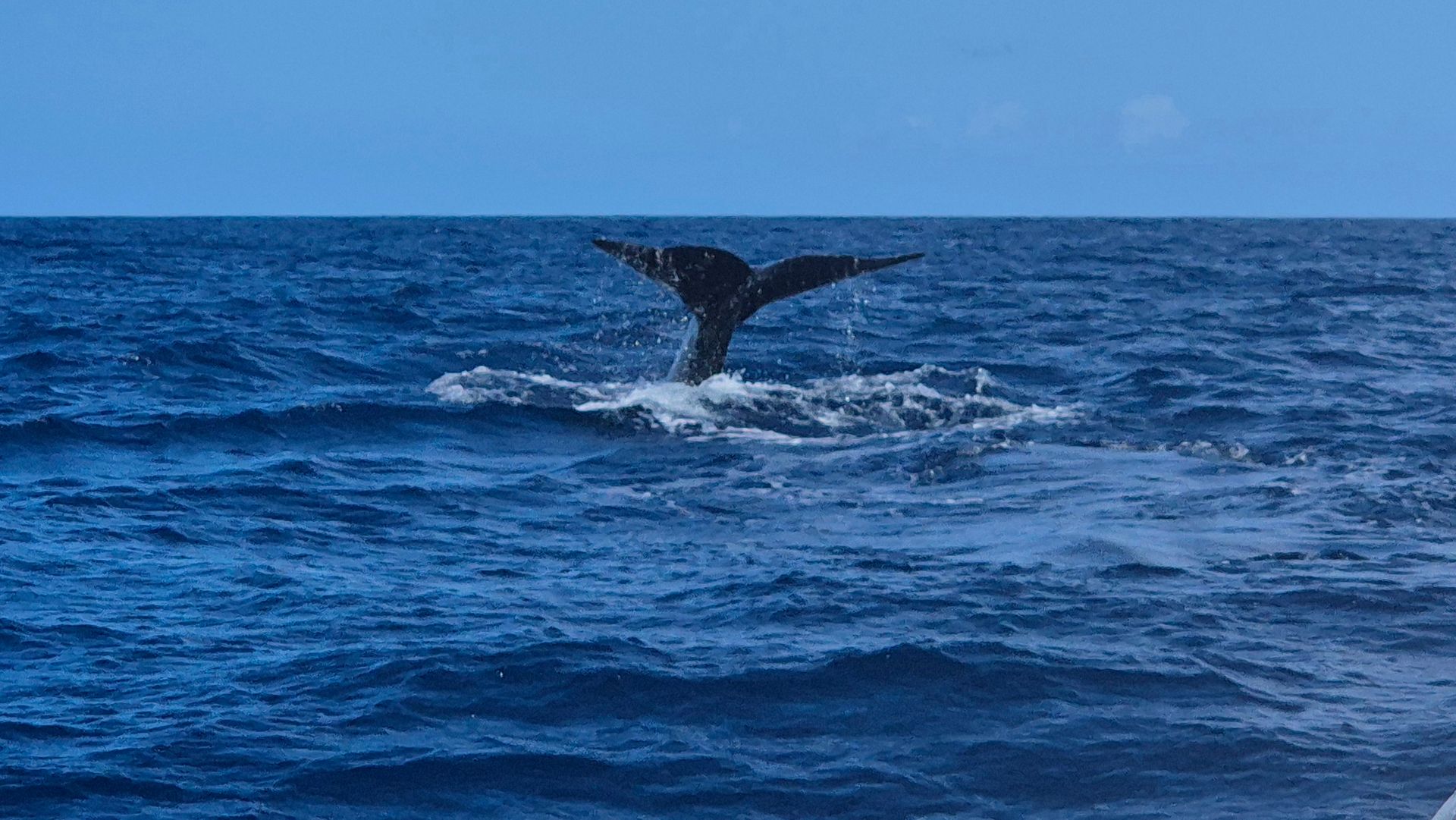 Als wir nach fast einer Stunde schon den Glauben an unser Glück verloren hatten, änderte der Bootsführer die Richtung und gab Gas. Schnell waren die ersten Wasserfontänen sichtbar. Ruhig, sanft gleitend schwammen vor uns zwei der riesigen Tiere im Wasser. In ausreichendem Abstand folgten wir Ihnen, ohne sie zu belästigen oder einzuengen. Die Anbieter solcher Touren kennen sich natürlich sehr gut aus und warnten uns natürlich pünktlich vor, als die Tiere begannen, abzutauchen und das einmalige Bild der Schwanzflossen festgehalten werden konnte.